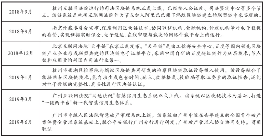 2019年8月,最高人民法院宣布正在搭建人民法院司法区块链统一平台目前完成最高人民法院、高院、中院和基层法院四级多省市21家法院,及国家授时中心、多元纠纷调解平台、公证处、司法鉴定中心的27个节点建设,联合四级法院共完成超1.8亿条数据完成上链取证固证,并已牵头制定了《司法区块链技术要求》《司法区块链管理规范》,指导规范全国法院数据上链。2020年5月25日,最高人民法院院长周强在2020年最高人民法院工作报告中提到,区块链技术在司法领域的应用,其中我国已建成国家统一的司法区块链平台,创新网上证书存储方式,解决电子取证难、认证存储难、认证难的问题。