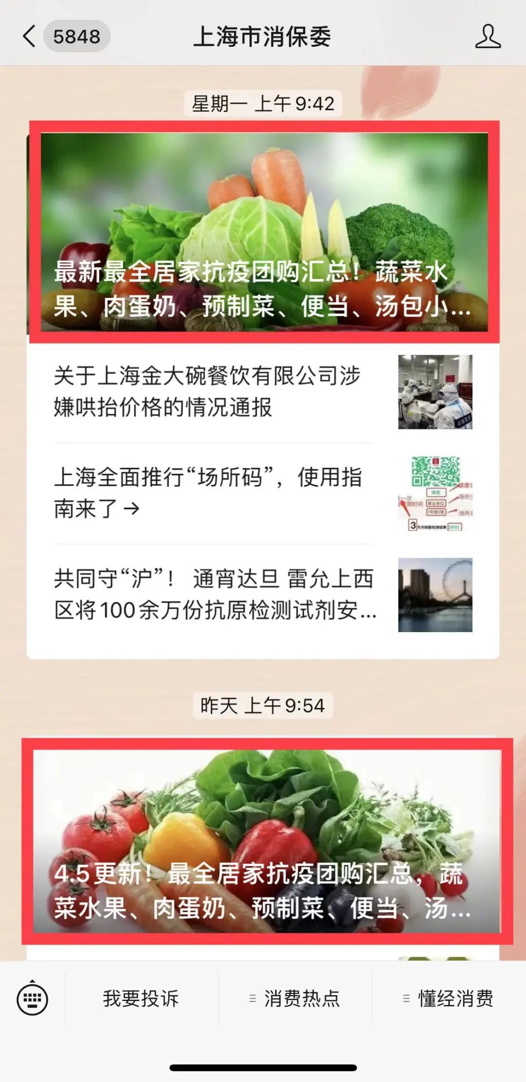 从4月3日至今,上海市消保委在其微信公众号连续四天推出《最新最全居家抗疫团购汇总》,爆红网络。四天内,6名消保委公号小编反复核实、查证,累计推出了60多家靠谱的团购供货商,从蔬菜、大米、禽肉等农产品直送服务名单,到肉蛋奶、预制菜、便当、汤包馄饨的居家团购买菜名单,涉及到居家饮食的方方面面,为身陷封控小区每天靠各种“蔬菜群”“奶群”“水果群”“鸡蛋群”度日的上海市民指了路、解了难。网友们齐声点赞,“消保委这波操作666,真实解决大家燃眉之急”, “这个帖子好,不用上当了” 。