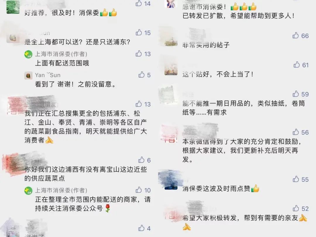 “居家抗疫团购”系列的推出,最先起源于浦东农委的线索。上海市消保委副秘书长唐健盛说,“浦东居民居家时间比较长,我们想着先尝试提供一些靠谱购买渠道。浦东区农委核实了部分有能力继续接单的主体,持续保障农产品有效供给,有需要的朋友们可以下单。”没想到,上海市消保委微信公众号内容一经发出,就引起了大量消费者的关注。网友们纷纷留言: