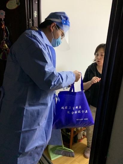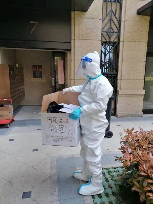 行政处党支部曹菊从3月30日起参加梅莲苑居委会防疫志愿者服务,并作为住所所在楼栋的楼组长,负责本楼栋10户人家共32人每天挨家挨户地垃圾收取、快递运送、防疫物资和抗原自测盒发放工作,及时通知每户人家下楼做核酸检测并维持检测秩序。同时,她作为楼组长,还负责防疫宣传等工作,劝导居民足不出户。她表示:作为党员,希望能以实际行动,为打赢疫情防控阻击战贡献一份力量!