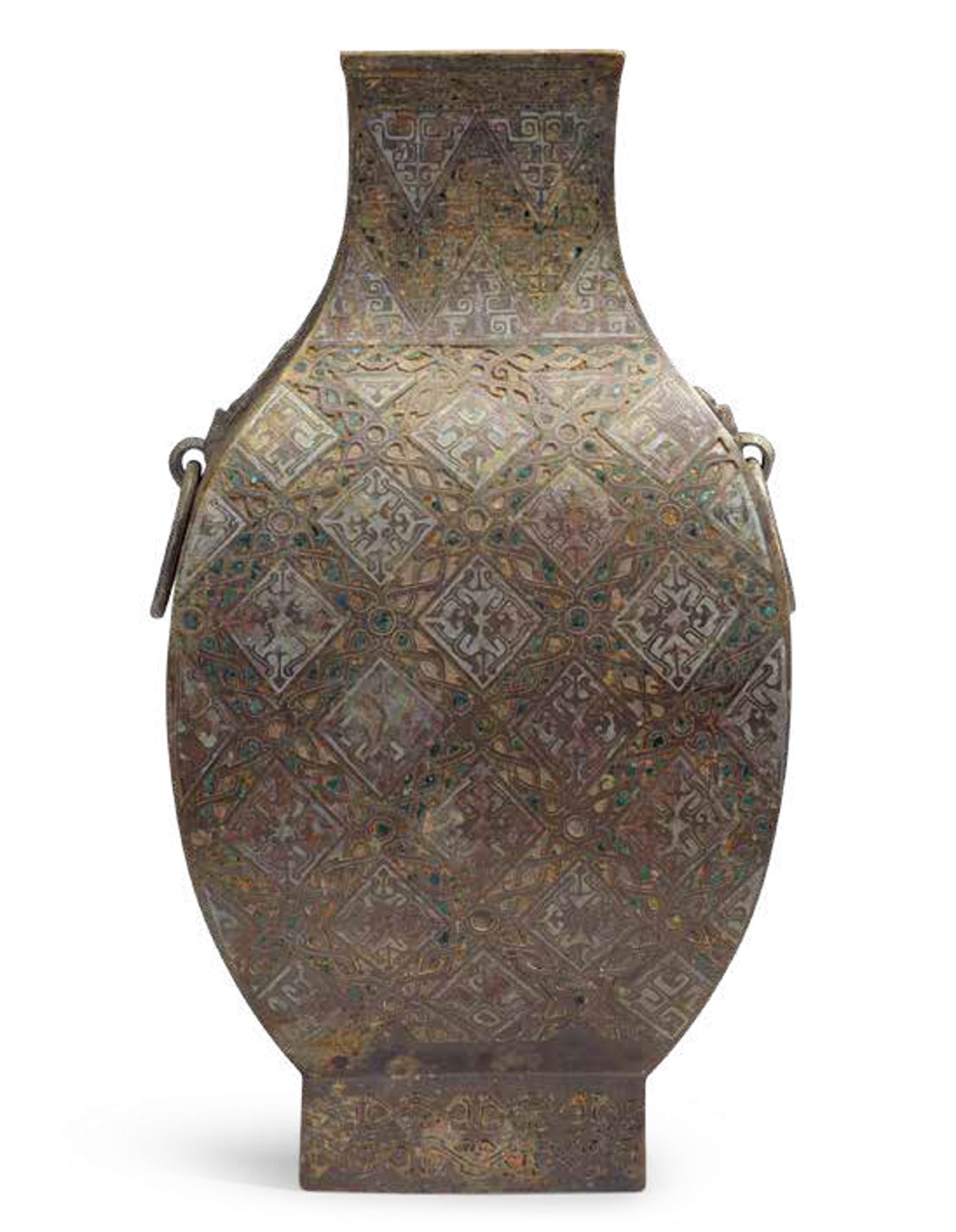 壶是盛酒的器皿,这种形式的方壶是战国时期(前475年-前221年)比较流行的式样。自春秋晚期(前6世纪上半叶-前476年)以来,青铜器的表面装饰有很大的变化。在构图上,除了传统的两方连续构图外,比较多地采用了四方连续的构图,甚至出现了以绘画形式表现的人物生活画面;在工艺上,除了传统的铸造方法外,还运用了鎏金、错金银、镶嵌和彩绘等新的工艺。所以这一时期的青铜器,表现出更为注重其装饰性而忽略了它们本来所具有的礼器特性。这件方壶主要采用了镶嵌的装饰工艺,用盘卷的红铜丝镶嵌在器表方形或三角形的几何图案中,将绿松石镶嵌在这些图案周边绳索形的条纹中形成界栏,从而达到使这件青铜方壶表面色彩斑斓的装饰效果。