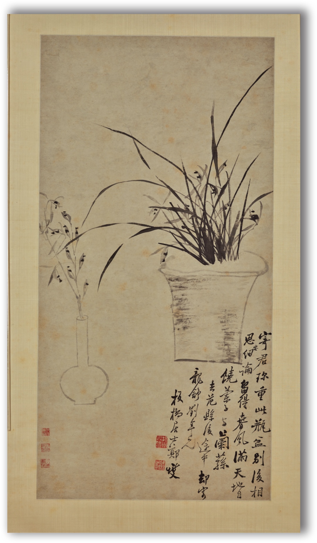 郑燮(1693-1766年),字克柔,号理庵,又号板桥,江苏兴化人。康熙年间秀才,雍正十年(1732年)举人,乾隆元年(1736年)进士,官山东范县、潍县县令,后客居扬州,以卖画为生,为“扬州八怪”重要代表人物。郑燮一生只画兰、竹、石,自称:“四时不谢之兰,百节长青之竹,万古不败之石,千秋不变之人。”其书不泥古法,自成一体,他将汉八分书杂入楷、行、草,自称“六分半书”。其诗、书、画,世称“三绝”,是清代极具代表性的文人画家。此幅《盆兰图轴》,瓶盆简笔勾勒出轮廓,略作皴擦,绘兰花两丛,盆中种兰,瓶中插花,浓墨写兰叶,纵逸多姿,错落有致;淡墨画兰花,花心用浓墨勾点,虚实相间,幽香雅秀。在构图上,两丛兰花相互呼应,题款的安排打破了画面左右匀称的构图,别具奇思,不落俗套,极富文人意趣。