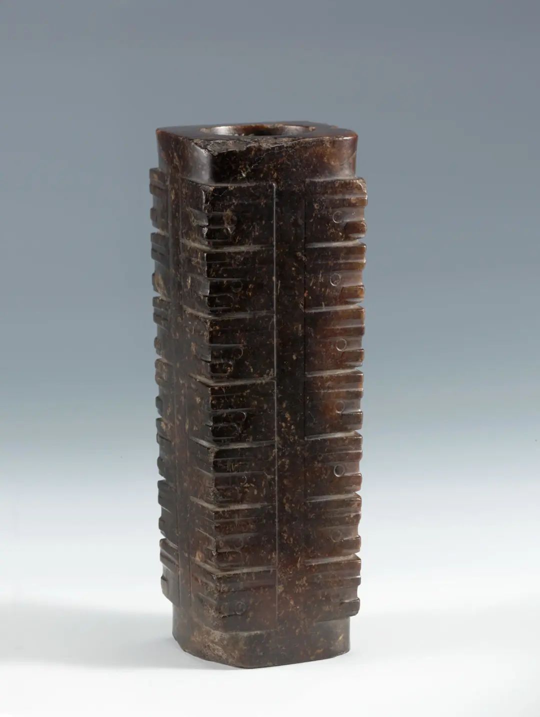 器呈棕褐色,近长方柱形,上大下小,内圆外方,分七节。外壁以四角为中线,各琢七组简化的神人面纹,二凸长棱象征羽冠,一凸短棱代表鼻子,双圈表示眼睛,制作谨严。