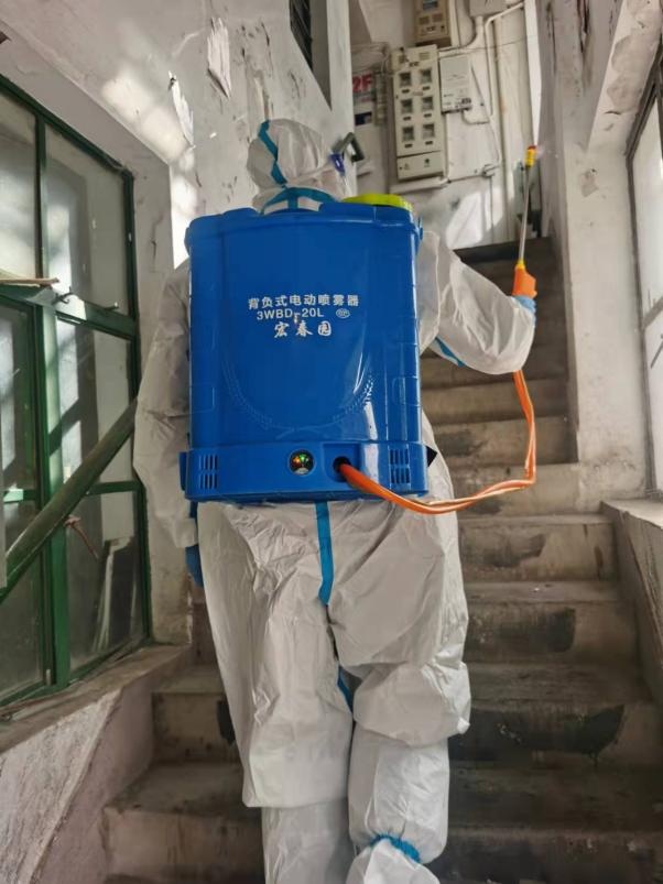 4月8日,天刚蒙蒙亮,老西门街道蓬莱路4号区域内,欣望公司志愿小分队的7名“大白”已经开始了新一天的预防性消毒工作。这一天,根据安排,他们要对小区内的道路、“五小”环卫设施等进行一次全面的消毒清洁,同时将昨天堆积的生活垃圾及时消毒、消杀,确保生活垃圾“不遗漏”。