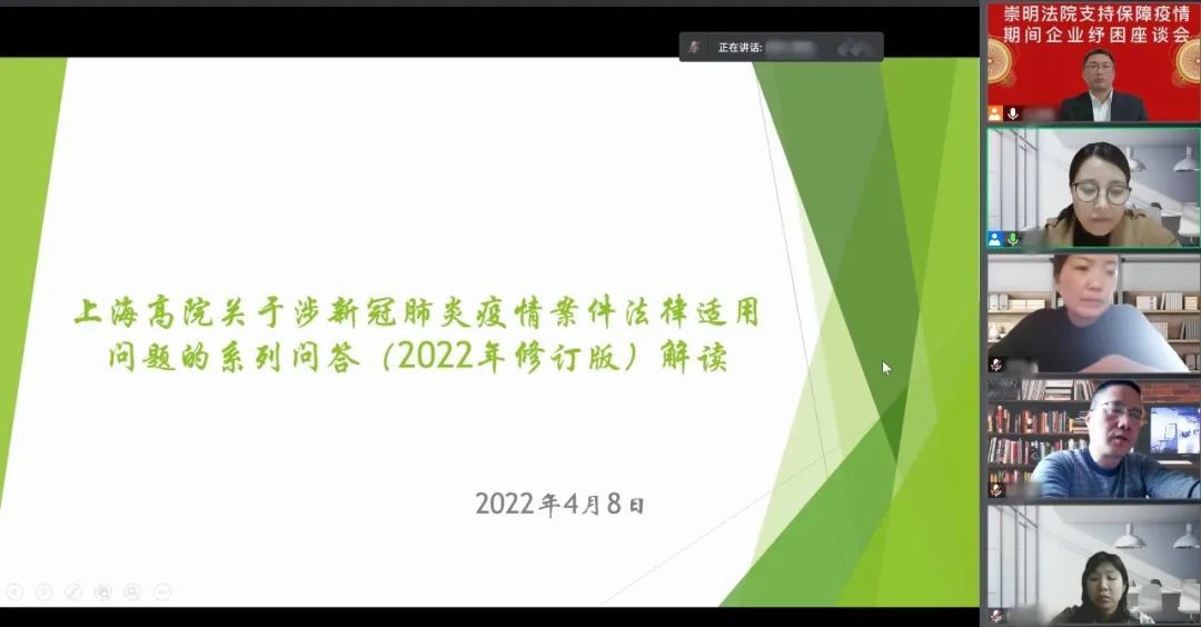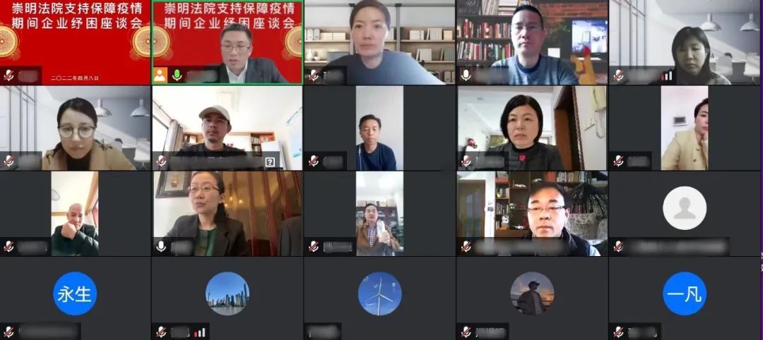 为进一步落实《上海市高级人民法院关于司法服务保障疫情防控和经济社会发展的若干意见》的总体要求,发挥人民法院司法职能作用,4月8日,上海市崇明区人民法院(以下简称上海崇明法院)通过线上的方式召开支持保障疫情期间企业纾困座谈会,上海崇明法院党组成员、副院长沈璇敏,崇明区工商联党组成员、副主席王可杰出席会议,崇明区工商联、园区、企业、金融机构及民宿经营主代表,上海崇明法院相关部门干警参加座谈会。