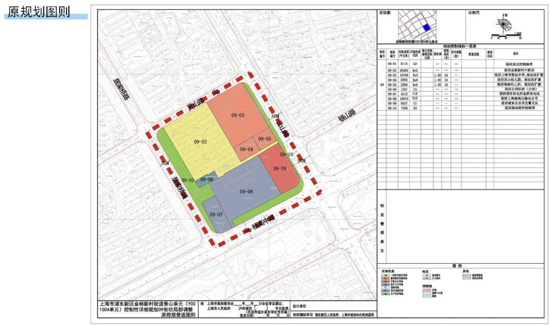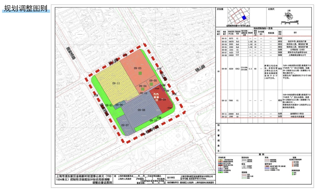 本次规划调整对象为金杨新村街道香山单元(Y001004单元)09街坊,其四至范围为:东至云山路、南至杨高中路、西至居家桥路、北至灵山路,总用地面积12.24公顷。