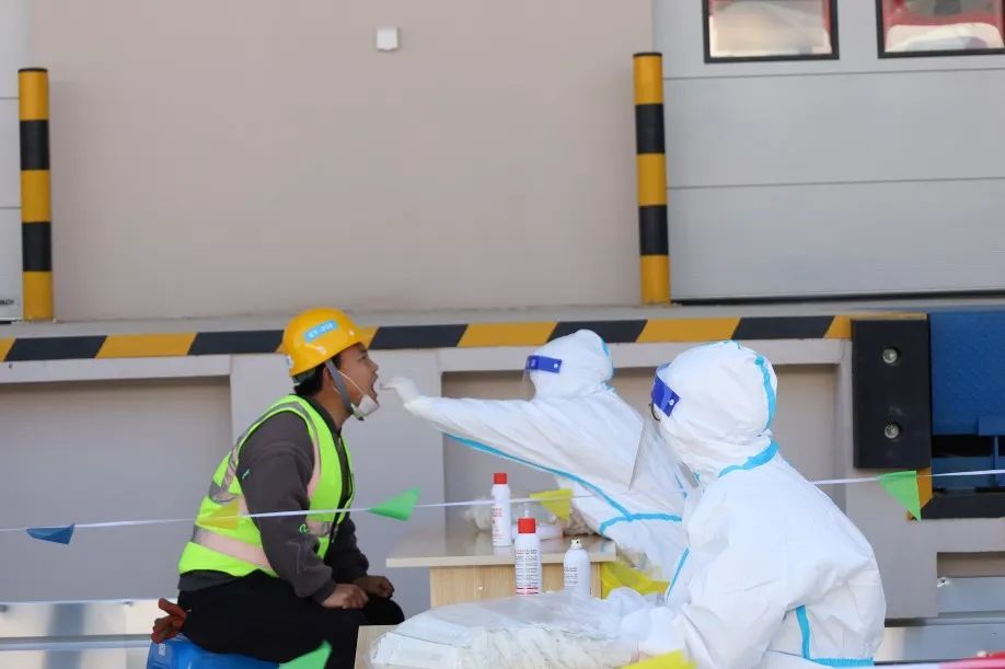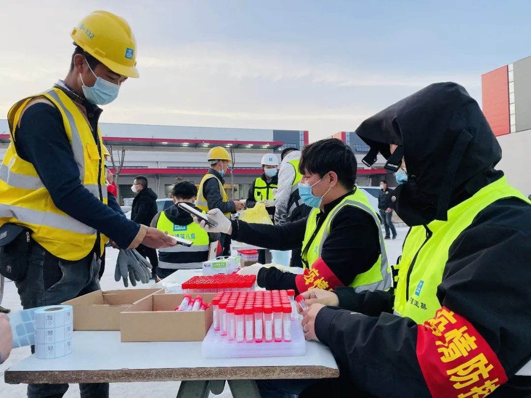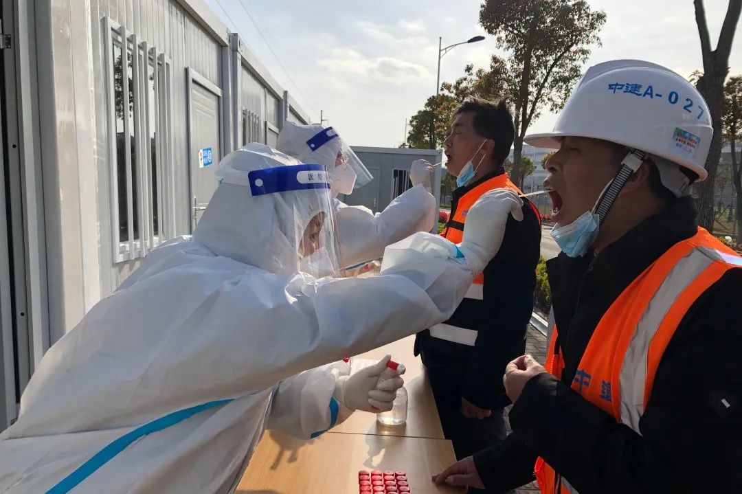在疫情高发区域做好防疫工作是保证项目顺利开展以及后续建成使用的基本保障。中建八局成立以临港分局牵头的防疫后勤保证组,组织各公司抗疫专员以及志愿者组成百人防疫小组统筹协调防疫以及后勤保障工作,将48小时核酸阴性作为入场基本要求,确保每天一次核酸检测、穿插抗原检测,保证异常点的及时发现和风险的及时隔离风控。