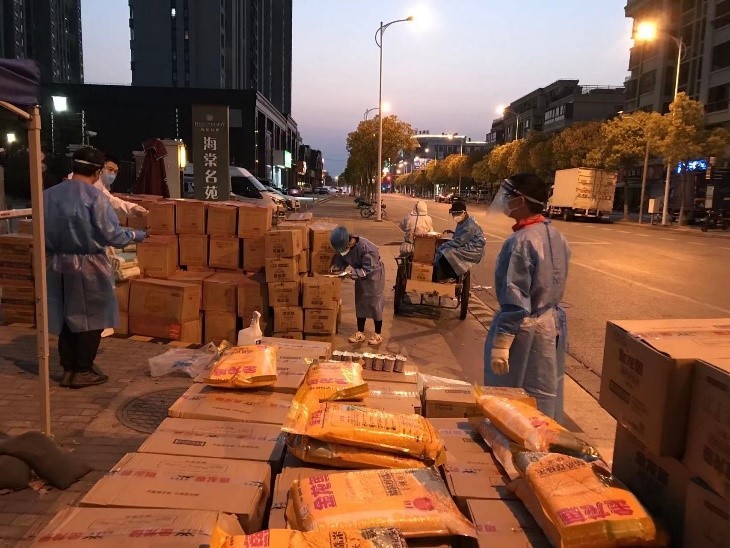 4月7日晚上8点多,第二批防疫物资送达小区。宋丹华再次带领5位党员和1位物业人员,蹬上三轮车为每个楼道当晚全部配送到位。“白天很多志愿者都在维护核酸检测现场秩序,还要忙着运送居民团购的牛奶和肉等生活用品,大家都辛苦。”他微笑着说,“有难事找我们!共产党员就应该不怕累、不怕苦,有需要帮助的,尽管吩咐。”