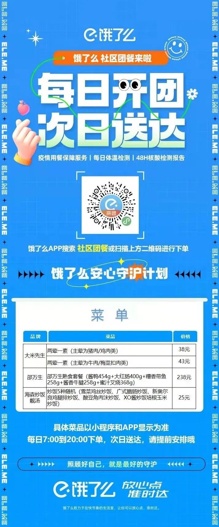 邵万生、永和大王、俏鲜莎生鲜等多家品牌联合饿了么推出社区团购服务,品类包含团餐、生鲜果蔬、半成品等。市民当晚下单,次日即可送达。