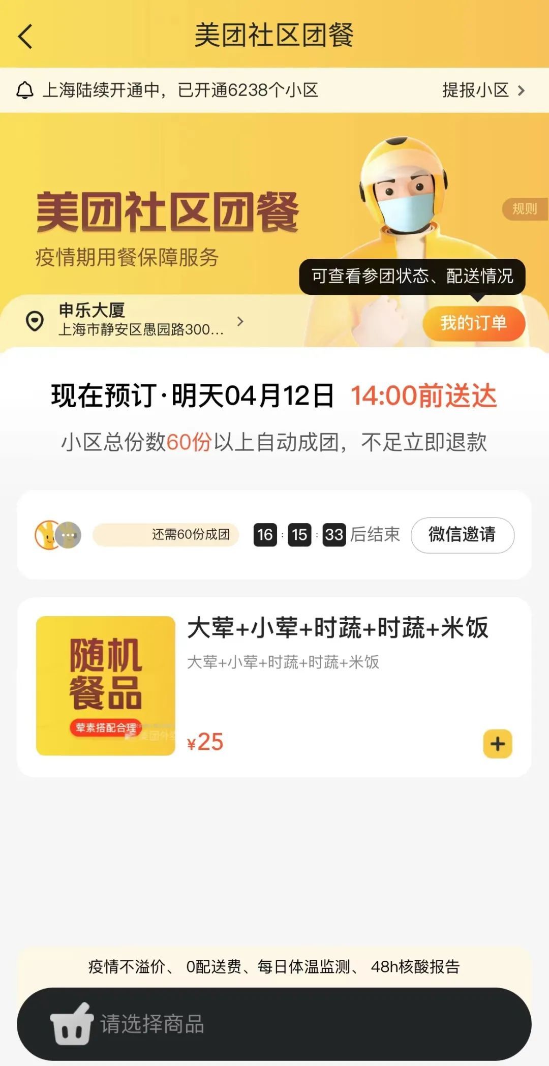 市民可通过美团外卖app的“社区团餐”入口集中点餐,同一小区市民在同一订餐时段满60单即可送餐。