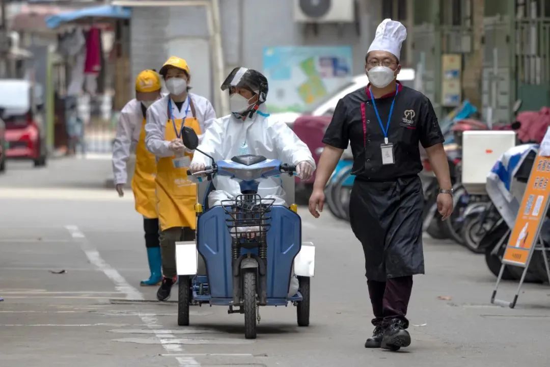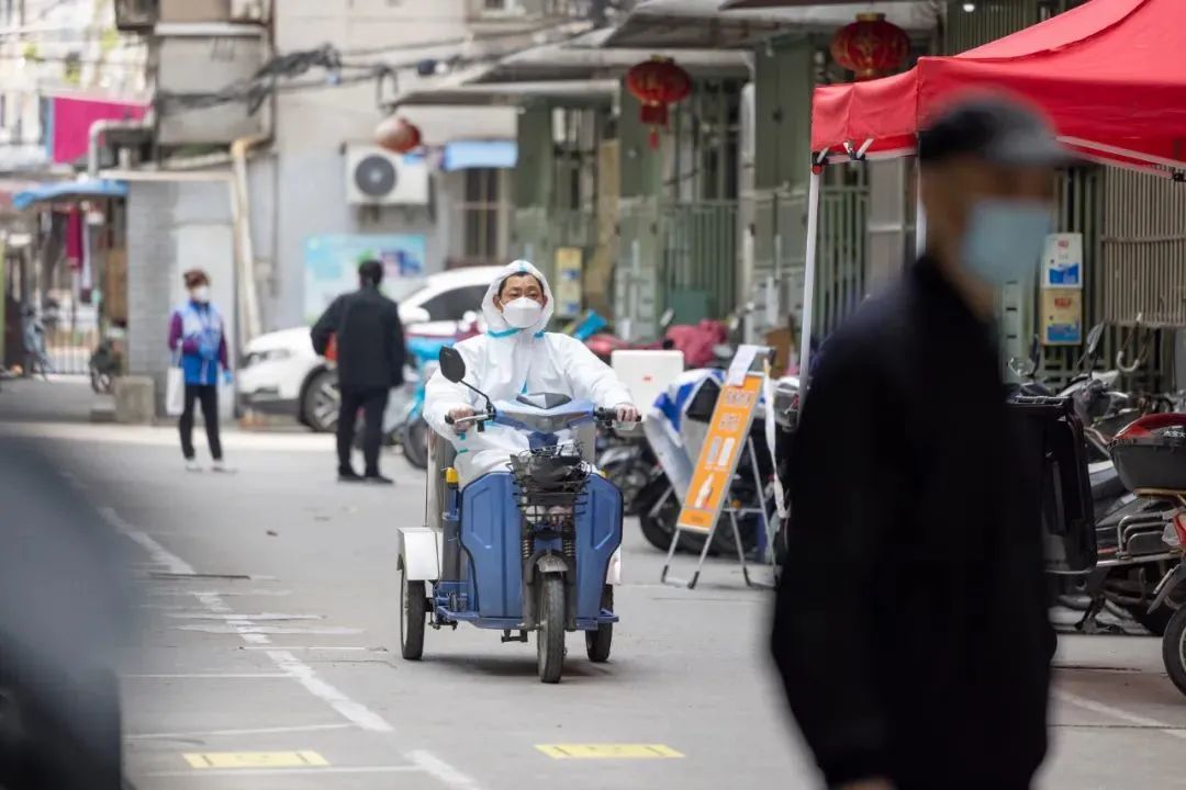 街道对我们很支持的,每天物资送到这里,都会组织力量消杀,为员工做核酸检测,确保他们安全。街道分管副主任胡映映上个月看到送餐员我们穿着一次性雨披送餐,觉得风险很大,马上给我们大白防护服。她9点多看到,10点多就送来50套。她说:“老倪,有困难你要说的呀,要提出来!”