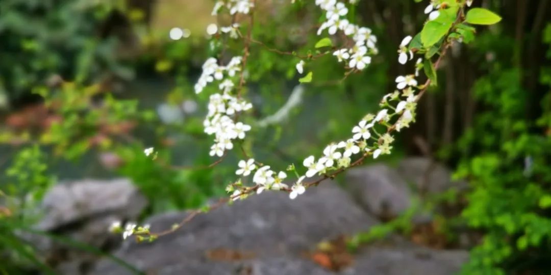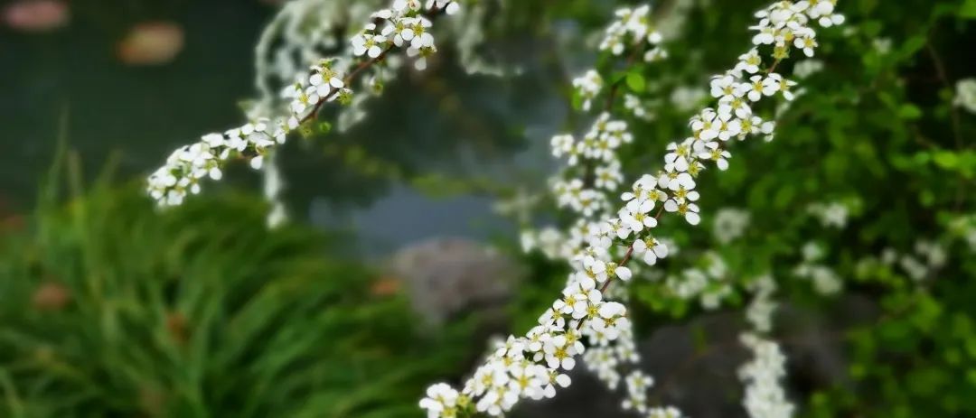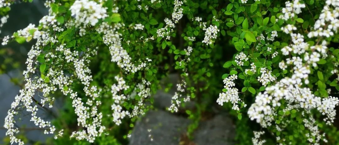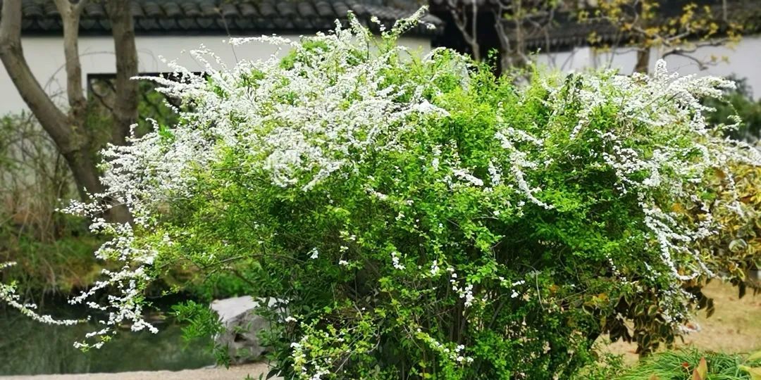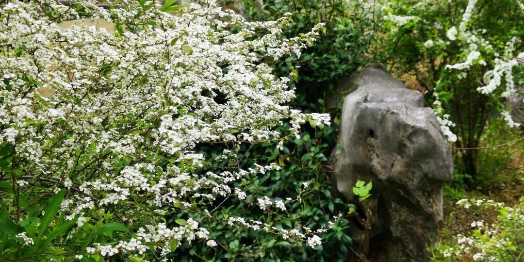 时下的醉白池,百花陆续盛放,一片生机勃勃,春意盎然,除了牡丹花开的惊艳之外,则以盆景园影壁前、曲水两岸秀石旁的数丛喷雪花最为夺目。只见其株丛丰满,枝叶清秀,长势茂盛,清雅的白花挂满枝头,仿佛身着一袭白衣,无论是单赏花朵还是整体观丛株,都会感到甚为幽美。