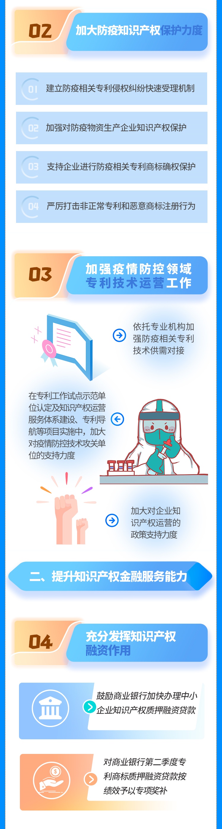 一是助力疫情防控。支持创造方面,优化防疫相关专利商标优先审查推荐机制和专利快速审查预审服务,在高价值专利相关项目申报认定和高级知识产权师职称评审中,加大对防疫相关研发企事业单位和防疫一线专业技术人员支持力度。加强保护方面,建立防疫相关专利侵权纠纷快速受理机制,加强对防疫物资生产企业知识产权保护,支持企业进行防疫相关专利商标确权保护,严厉打击非正常专利和恶意商标注册行为。促进运用方面,依托专业机构加强防疫相关专利技术供需对接,在知识产权运用促进相关项目中加大对疫情防控技术攻关单位的支持力度,出台政策加大对企业知识产权运营的支持力度。