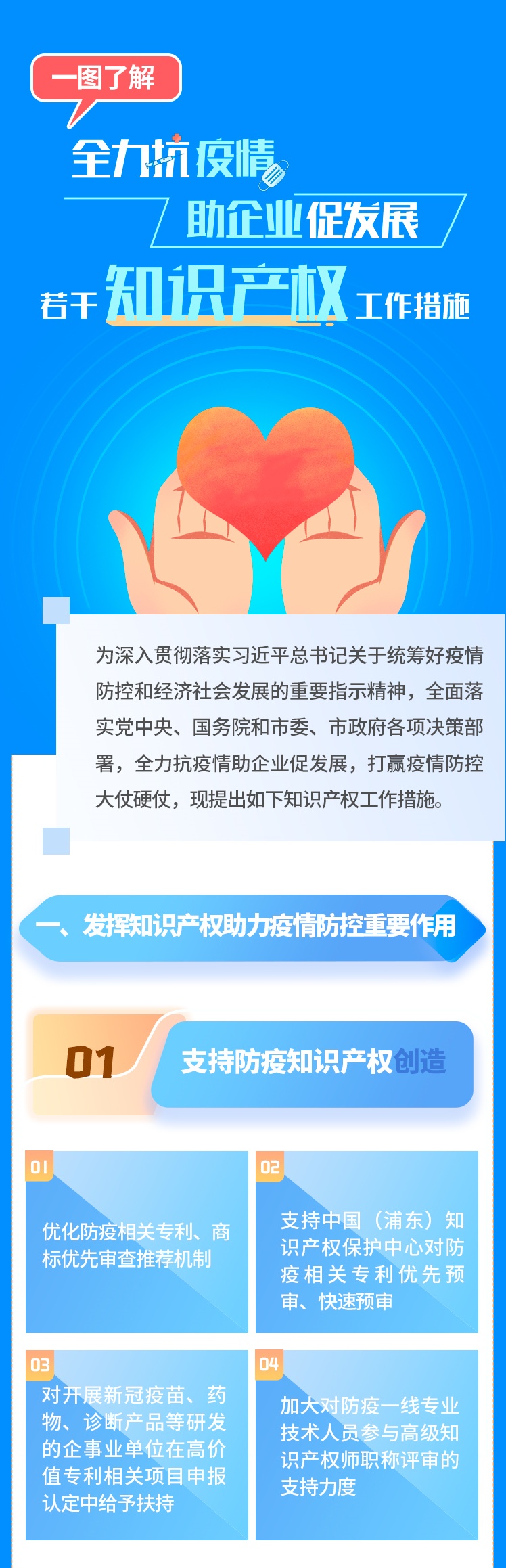 市知识产权局介绍,为统筹好疫情防控和经济社会发展,出台《全力抗疫情助企业促发展的若干知识产权工作措施》。该《措施》聚焦发挥知识产权助力疫情防控重要作用、提升知识产权金融服务能力、帮助困难企业恢复发展、加强知识产权服务保障等四方面共11条具体举措。图解详见↓