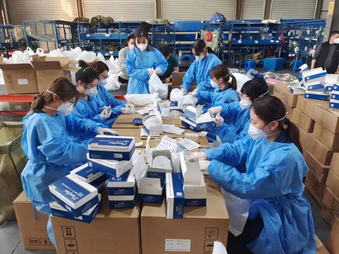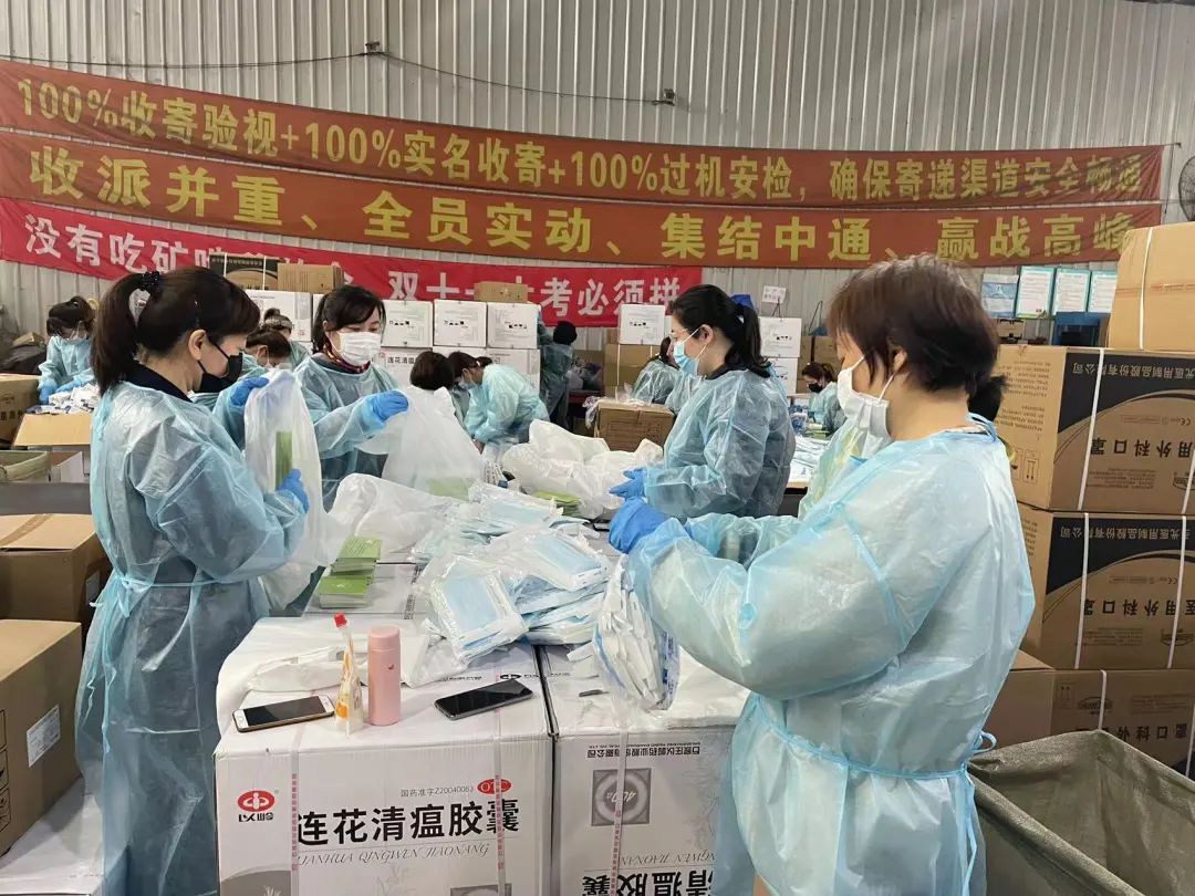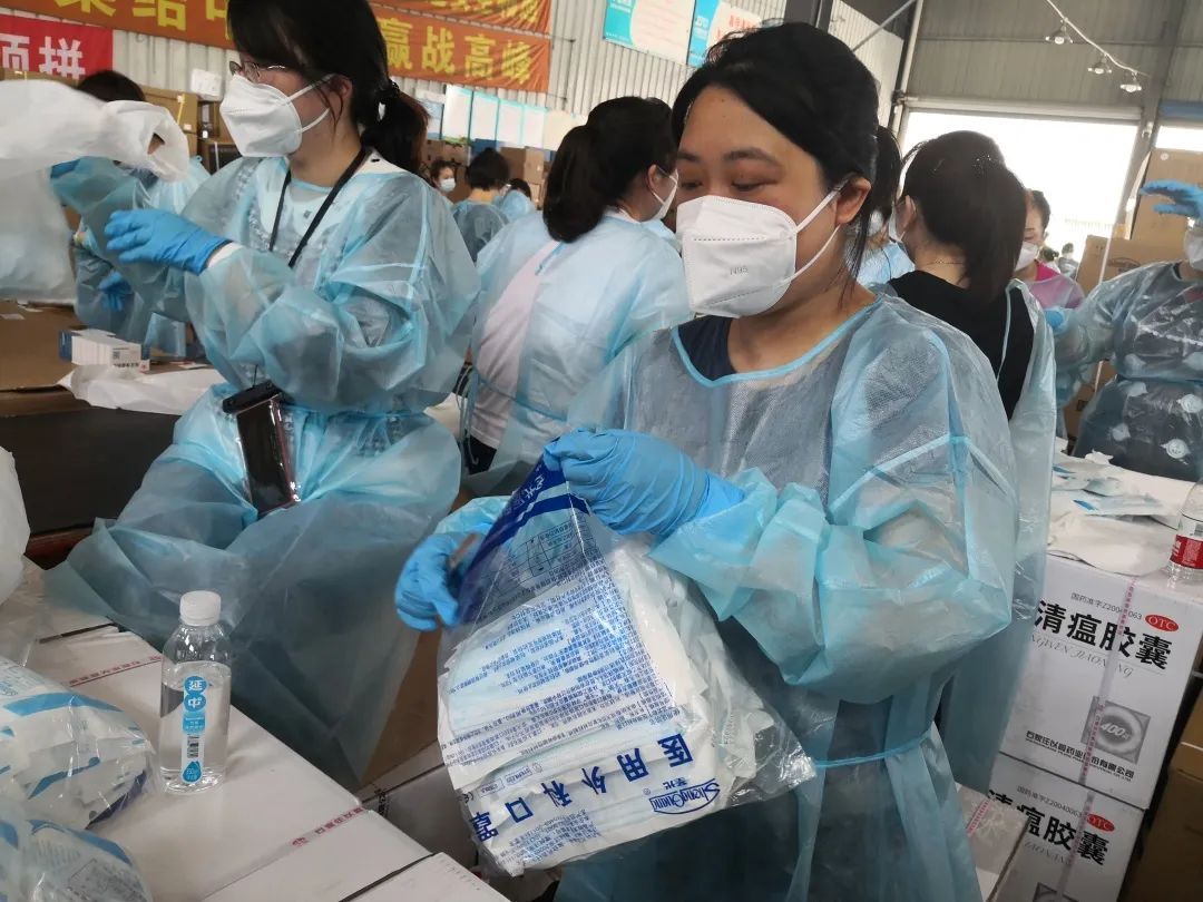 23名宝山教育系统的突击队员甘愿成为“流水线”上的工人,一遍遍分拣口罩、抗原试剂、连花清瘟胶囊等防疫物资。