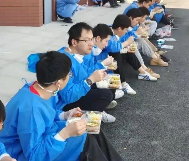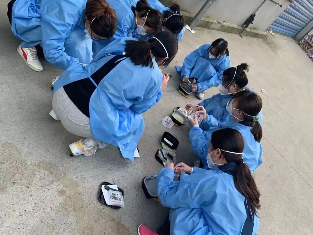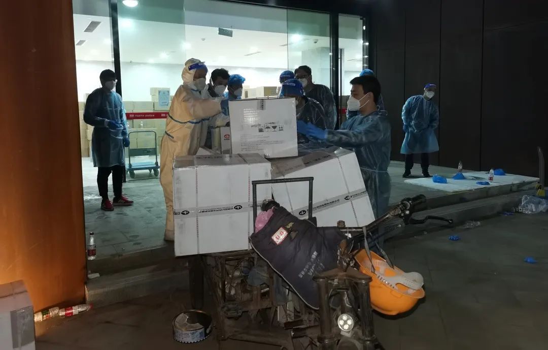尽管机械的动作已让队员们的肩、颈、背、腰酸痛不已,连续的高温让他们苦不堪言,但谁都没有停下手中的操作,只为尽早把防疫物资送到居民的手中。