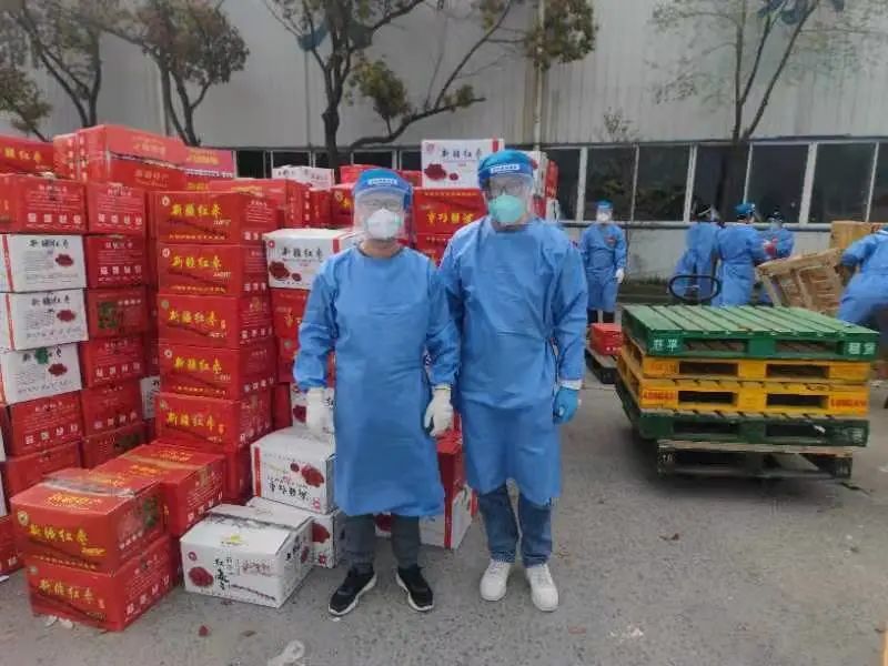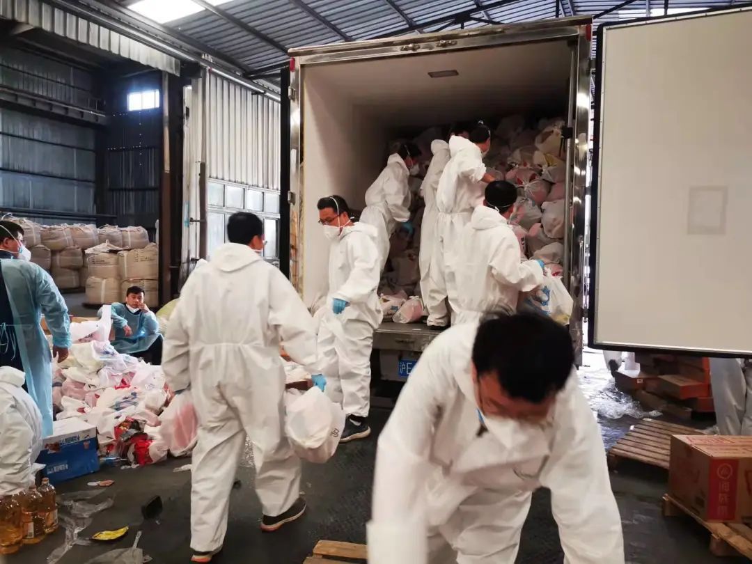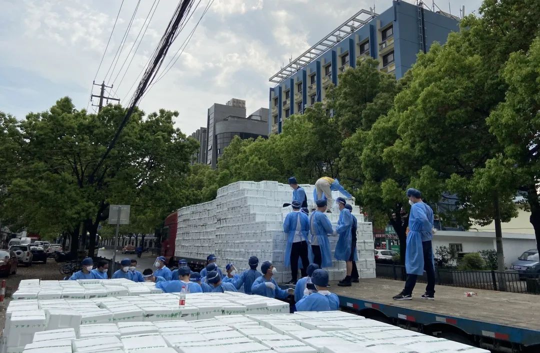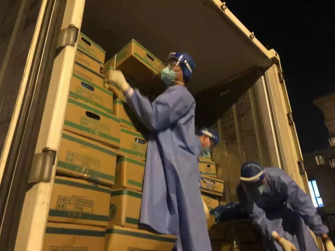 在分拣点,他们进行流水线作业,对防疫物资开展卸货、分装工作;在街镇,他们搬运蔬菜、食品、牛奶等生活物资,为保障居民物资“最后一公里”贡献自己的力量。