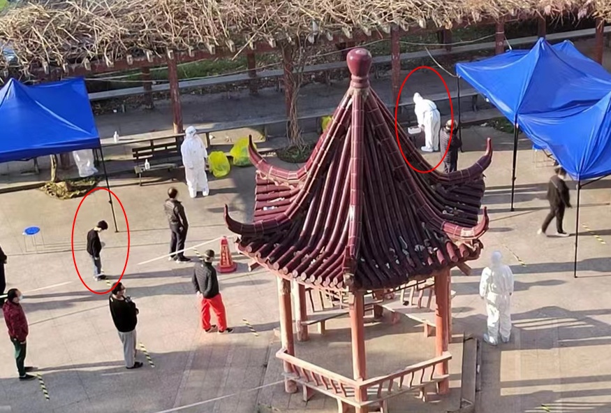 提起家人,王慧君还向小嘉展示了一张照片。照片中,她穿着防护服在核酸检测现场维持秩序,几米开外,儿子正在排队等待检测,两人背向而对,姿势却一模一样。“一家人心有灵犀、默契相伴,是最坚实的战‘疫’联盟。” 王慧君说。