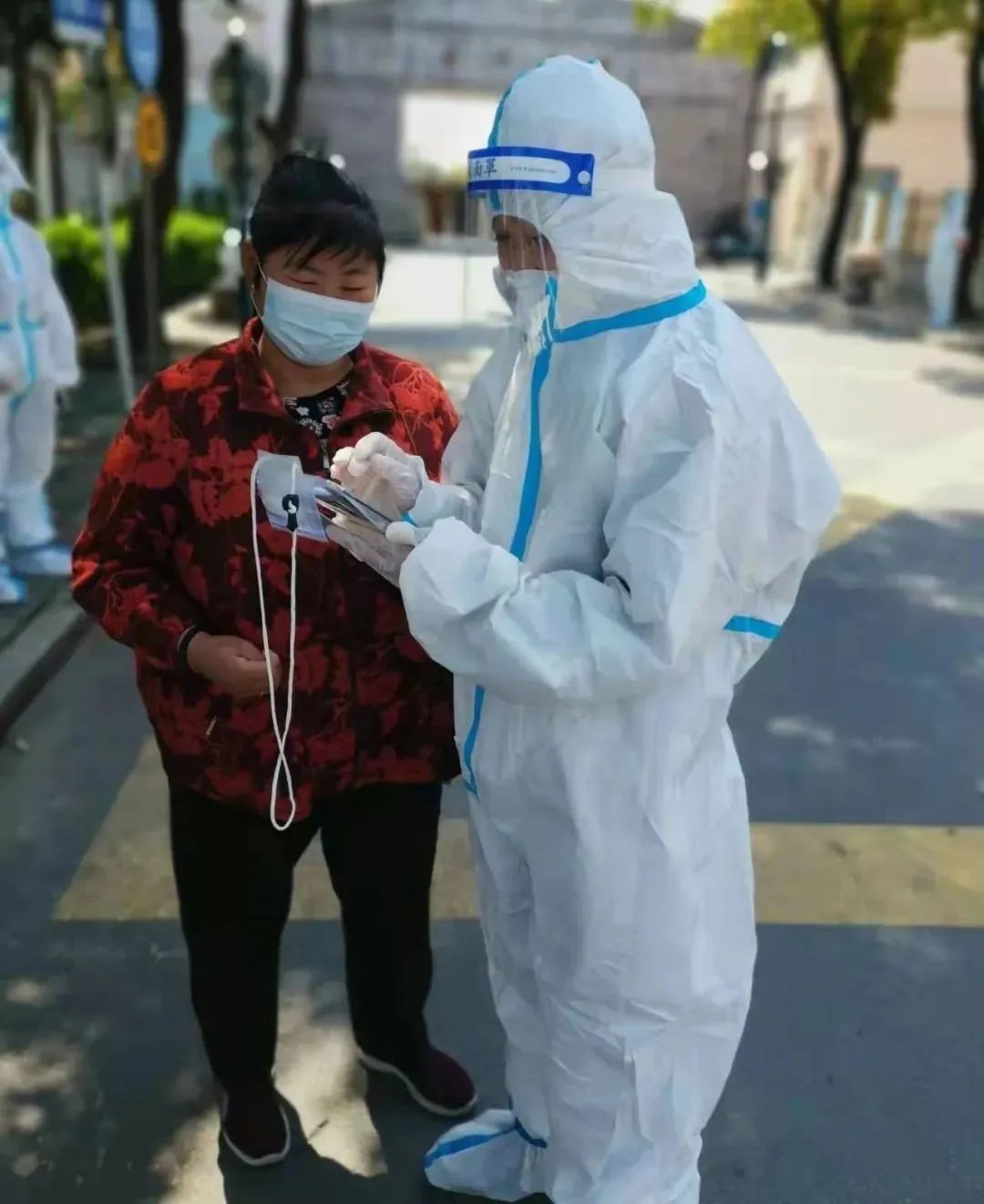 4月4日是叶晓芳特别“脆弱”的一天。她在朋友圈里写道:一是因为搭档医生的辛苦。前一晚8点接到通知后,他们连夜坐6小时大巴驰援上海,早上7点抵达小区,便投入到紧张的核酸采样中。从浙江建德出发到核酸检测结束,防护服一直在身上没有卸下。还有一件事让叶晓芳尤其破防。“我身后的医生小姑娘接到了奶奶的电话,熟悉的乡音让我倍感亲切,奶奶在电话里问:‘小菲,你在哪里?……’老人年纪大,听力不太好,几个回合下来,其实就说了一句‘你要保护好自己呀!’那一刻,小姑娘哭了,我也忍不住掉眼泪。”