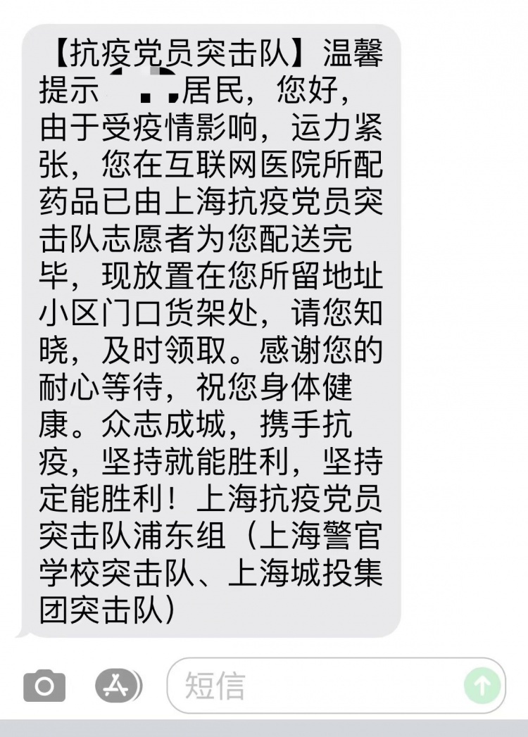 配送路线得到优化后,如何让群众掌握药品送达信息以便及时领取,是突击队思考解决的第二个问题。在上海城投集团科技信息部支持下,突击队与第三方服务平台建立联动机制,在药品送达小区后,突击队指挥部便会向第三方平台发布信息推送指令,居民的手机便会收到药品送达短信通知。为更好提升群众体验,突击队专门编写了体现特色、充满温情的短信内容,在特殊时期尽自己力量缓解焦虑,送上暖心守护。