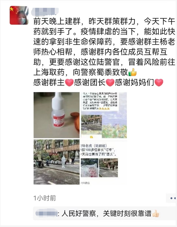 “感谢背后的‘英雄’,感谢陆警官,帮助100多名孩子……”“我家孩子已断药一个月,现在终于有药了,谢谢大家!”近日,崇明公安分局城桥镇派出所第一责任区警务队队长陆顾超收到不少居民群众发来的感谢讯息,表示已经收到跨江“团”来的所需药品。