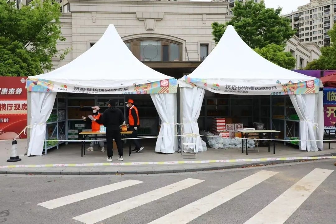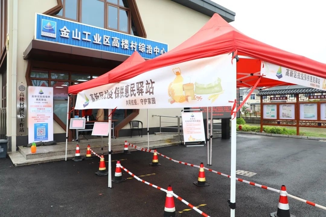 4月15日,金山区第三批“防范区”开放,高楼村不少村民拿到了可以去往镇区采购的出入证也没有选择出村采购,而是选择了村门口的惠民驿站。当天下午3点左右,高新区发布公告,“防范区”居民可以在防范区内采购物资和就医,收到消息的高楼村村民,第一时间就前往抗疫保供惠民驿站,购买生鲜、生活用品。大家戴着口罩,隔着两米线距离,秩序井然。
