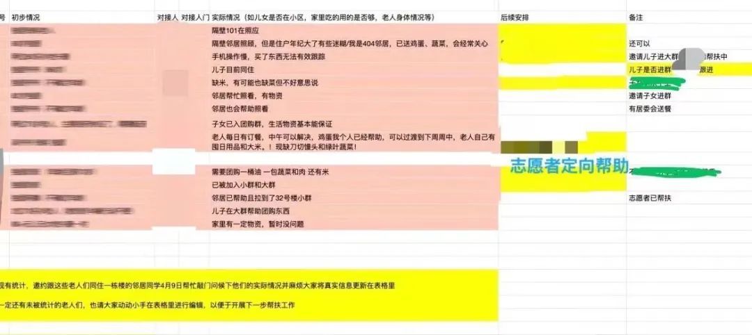 “必须注意的是,老人需求必须分级和精细化管理。”冯一侃说,在对老人信息全方位、无死角的排查后,志愿者们对老人需求分类标注,梳理了清晰的图表,第一类是有急需需求的,如有基础病或急需用药等,常问候、记录问题并及时上报;第二类是老人愿意接受帮助的,志愿者便每隔一天、两天前去关心;第三类是老人表示不需要帮助的,仍留存在志愿者底表上,保持关心。