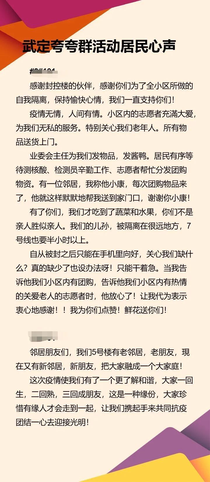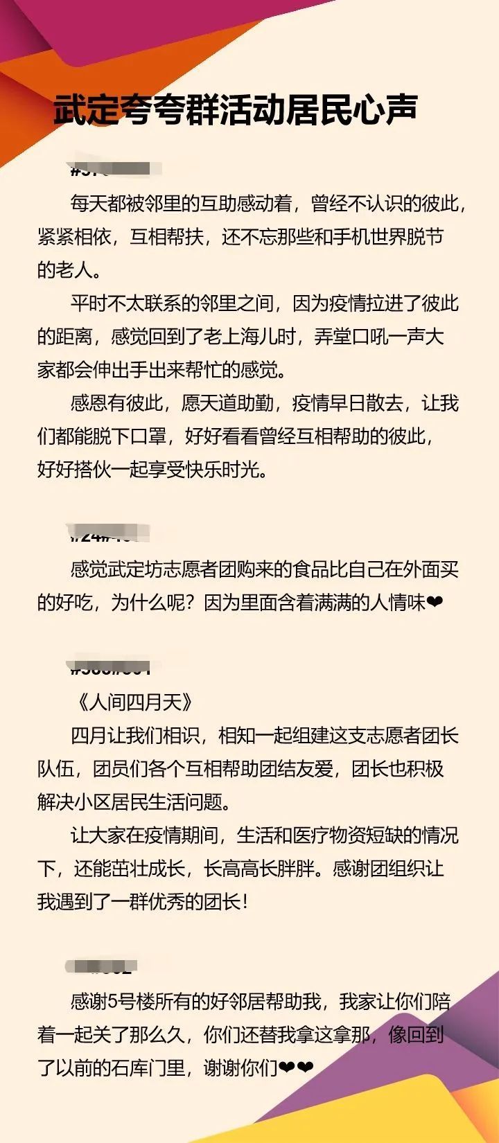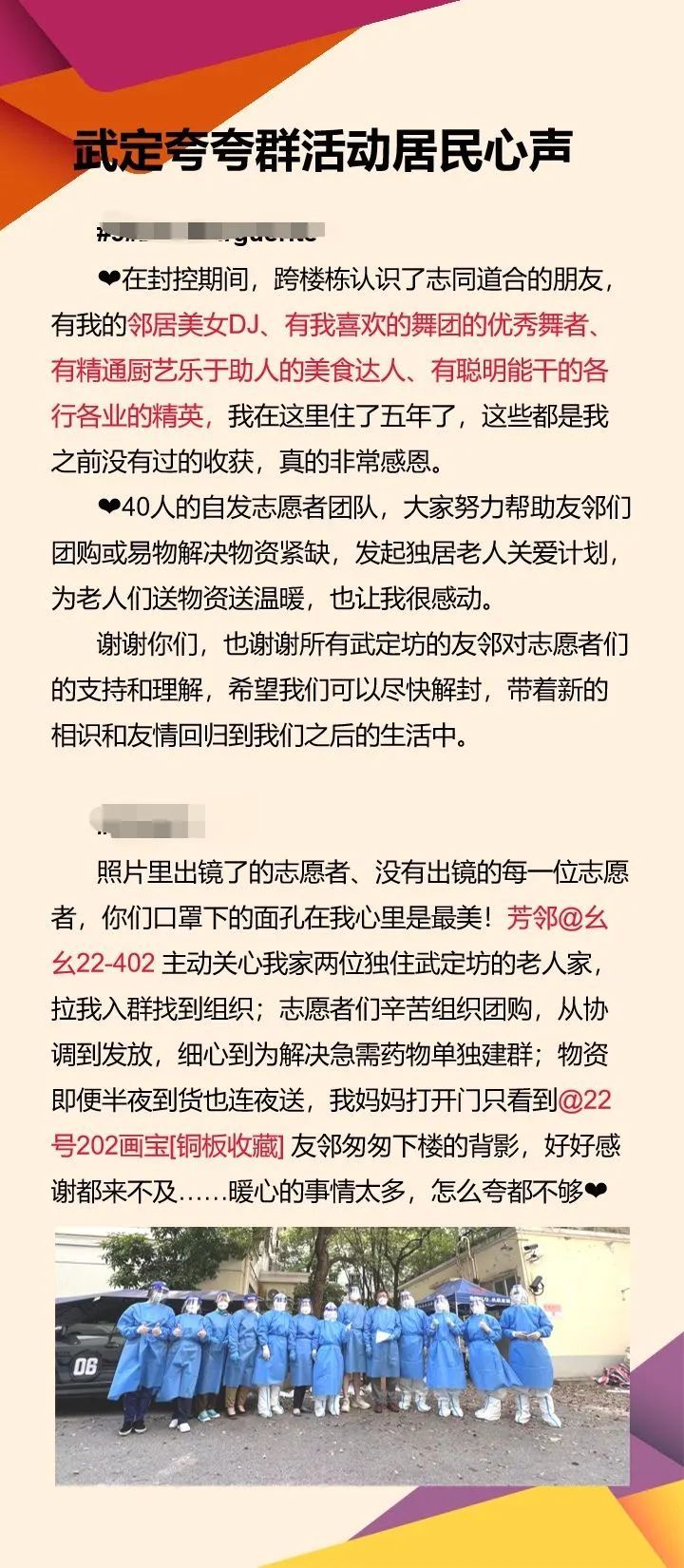让冯一侃有些担心的是,随着封控时间延长,居民的心态或多或少会有改变,有焦虑、有不安,这一点,在一些志愿者的身上也有所反映。为此,他策划“志愿者倡议”视频的发布,线上“夸夸群”活动等,随着对社区志愿者倡议的视频发布,让志愿者以外的人更了解社区志愿服务的工作,增加正向能量的传递;4月12日,社区发起武定坊“夸夸群”活动,居民们线上互相加油鼓劲,表达温暖和善意,“多关注一些正向的积极的,相信我们可以共渡难关。”