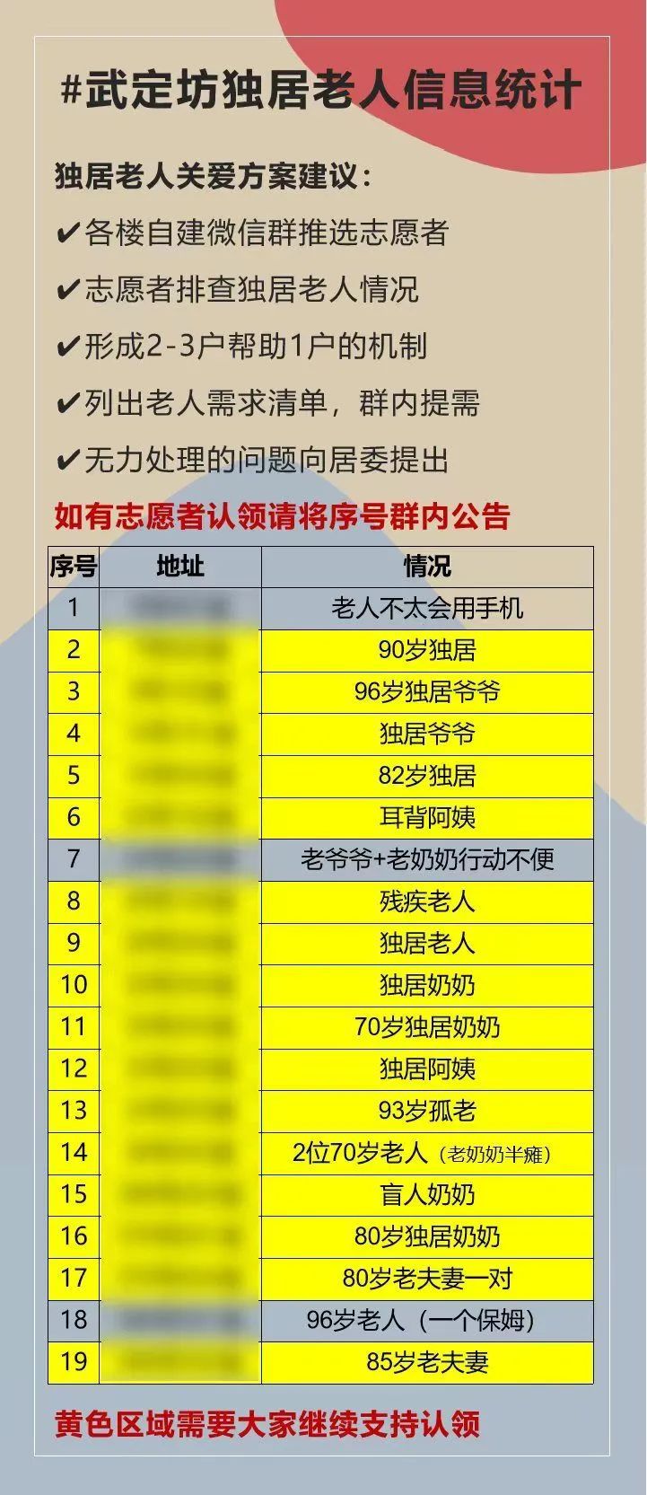 据了解,武定坊有居民453户,志愿者们上门排摸后发现,需要关心的老年居民有81户。过程中,志愿者们不仅了解了情况,还尽力收集了老人亲属的信息,对于一些身边无子女陪伴的老人,将其亲属也拉入微信群,让他们参加线上团购,由所属楼栋志愿者来帮老人取货。对于一些会用智能手机、可以自主“接龙”的老人,大家也会加以留意。志愿者也发现,还有一部分老人不愿意提需求,但从老人的邻居处,志愿者了解到了老人的需求后,也引发了志愿者对于老人帮助方式的思考。