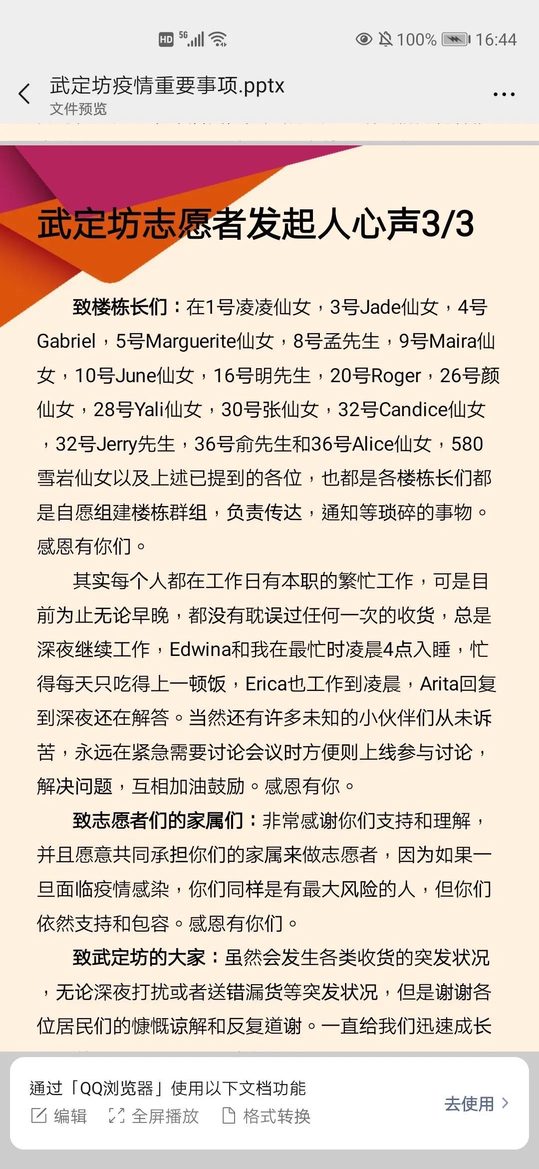 “80后”的冯一侃是豫园集团的一名员工,是后来加入团购运营团队的,在他看来,在服务中注重对“重要信息的可视化”能更直观更高效,为此,他将通知或重要信息做成图片或PPT等形式,每天更新武定坊疫情重要事项的PPT,整理需要帮助居民解决、确认的事情,以及微信群运营管理的规范等等。信息清晰明了、有章可循,同时也公开透明。