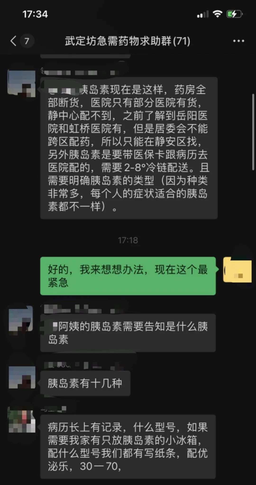“胰岛素非常紧缺,且需要冷链配送,对配药时间的要求更高。今天,我们刚刚解决了一位居民的紧急用药问题。”Issa告诉记者,小区是从3月27日开始封闭管理的,封控第三周开始,老人配药需求增多,截至4月15日,志愿者共为28户居民完成了配药需求。“在前两个礼拜,老人需求主要是以买菜为主,现在更集中在配药。在志愿者群里面,了解到老人需求后,大家都会第一时间把所有的渠道放在群里,并及时帮他们配药。”