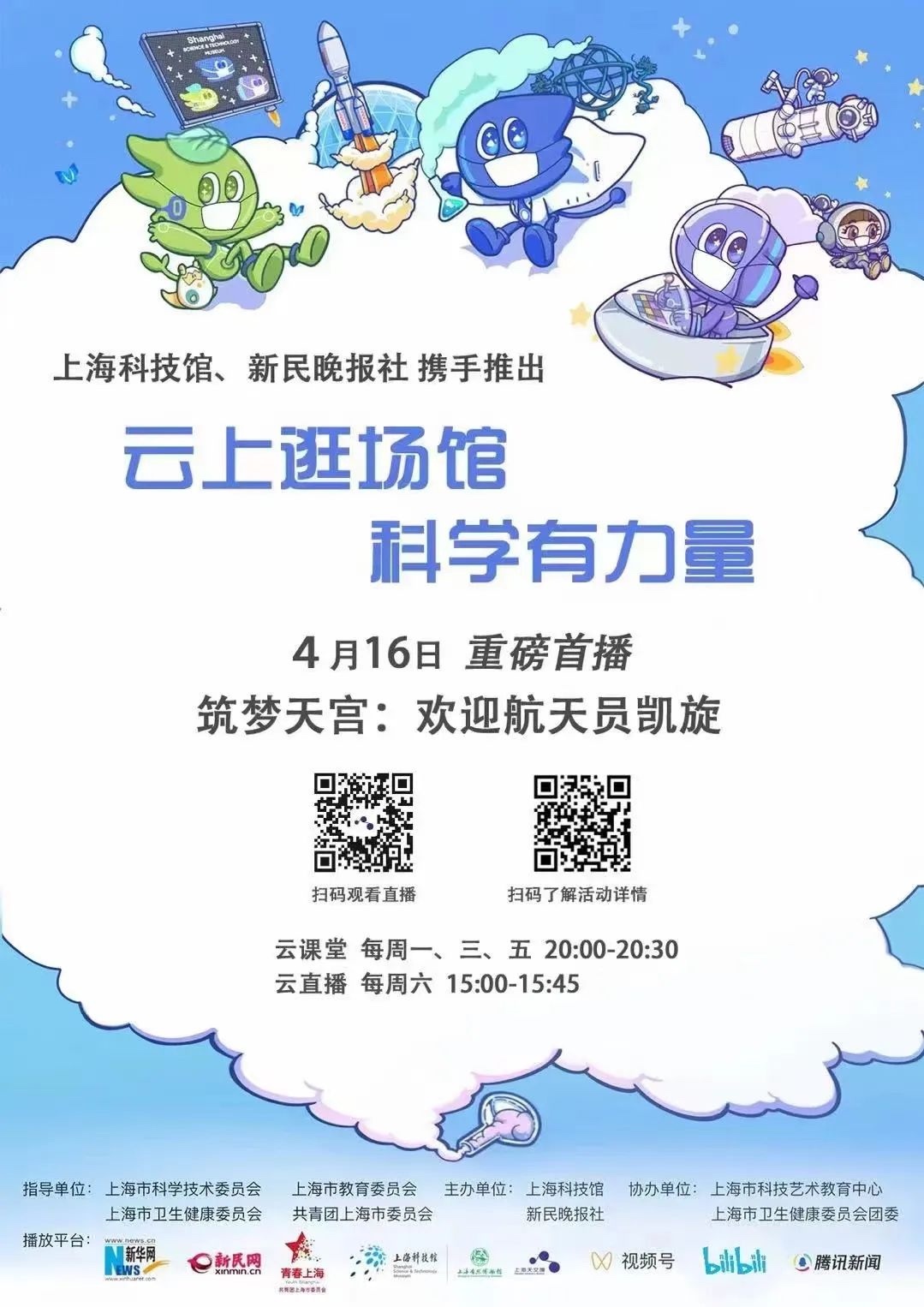 该场直播是上海科技馆和新民晚报社联合多个平台开启的“科普进家庭,科普进方舱”系列活动的首场云直播。上海天文馆展教中心网络科普部部长、市天文学会副秘书长施韡担纲主播,带领青少年云游航天梦,探访中国航天员的太空足迹。