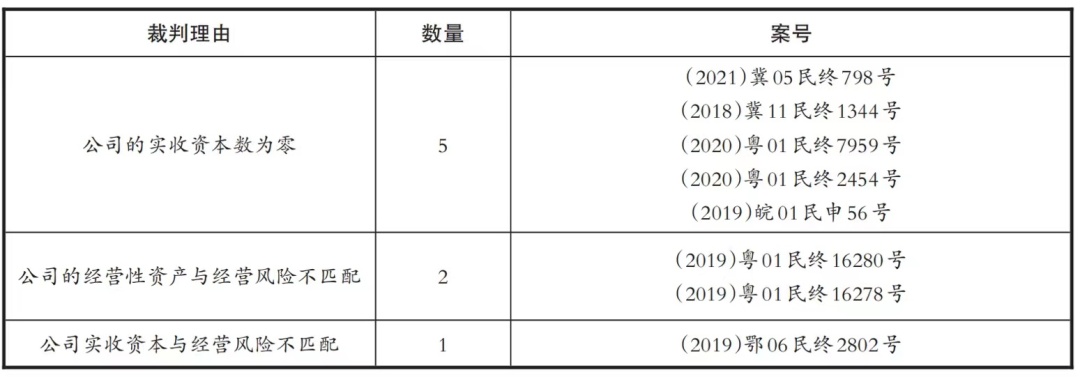 为尽量避免其他因素对否定公司独立人格的影响,笔者选取上述以资本显著不足为唯一裁判依据的8件案例,对其裁判理由进行分析,分析如下:5件案例中出现了公司实收资本为零的情形,法院据此认定公司资本显著不足,进而向股东追索连带责任;2件案例中出现了公司的经营性资产与经营风险不匹配的情形((2019)粤01民终16280号、(2019)粤01民终16278号案例系关联案件,经审理法院查明,被告公司在2016年已实际停止营业,且在另案中未发现该公司有可供执行的财产);1件案例中出现了公司实收资本与经营风险不匹配的情形(在该案中,被告公司从事高档汽车销售业务,单台车辆的价值均在数十万之上,而其实收资本仅为15万元)。