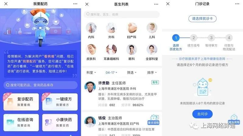 当然,更多市民用于治疗的处方药只能找医院配药。封控期间,互联网医院成为配药的重要渠道。记者实际体验发现,目前上海市互联网医院就诊配药有两种途径:通过“健康云”平台,或者各大医院开设的互联网医院。