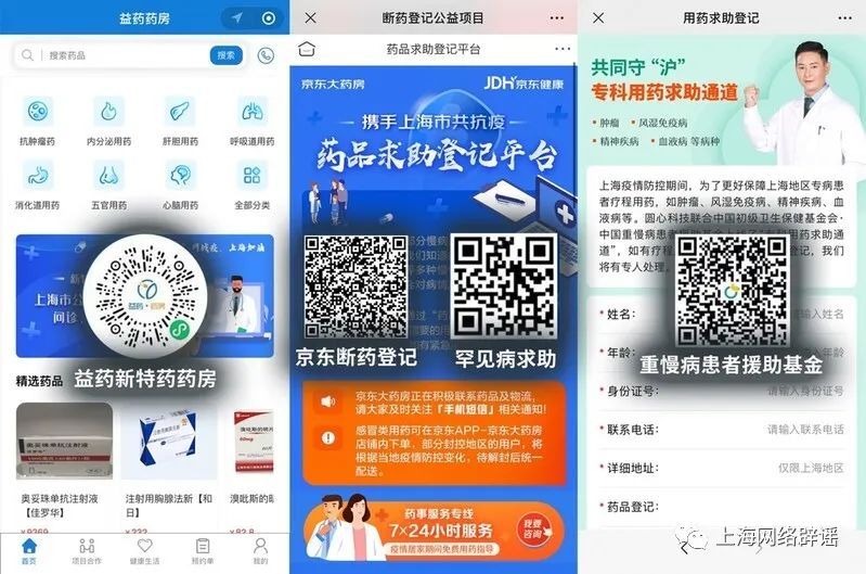 此外,对于一些重疾病的处方药,普通药店没有库存,患者可选择在“益药·新特药”小程序上购买。益药小程序是上药云健康开发的云药房,疫情期间,特别推出了新特药和慢性药的保供服务。对于如肿瘤靶向药、自身免疫疾病、罕见病、重大慢性疾病等患者的新特药用药,患者需上传处方,经药师审方之后,即可预约购药。另外,京东健康、中国重慢病患者援助基金会等也都开通了药品求助登记渠道,有药品急需者可在平台登记,等待回访。