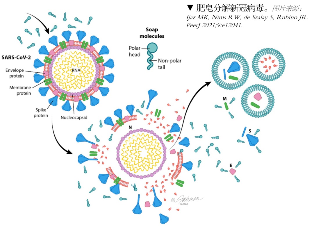那为什么肥皂、洗衣粉也能灭活病毒呢?别忘了,新冠病毒是亲脂病毒,脂溶剂可以破坏它,洗涤剂里面含有表面活性剂,也可以破坏病毒。