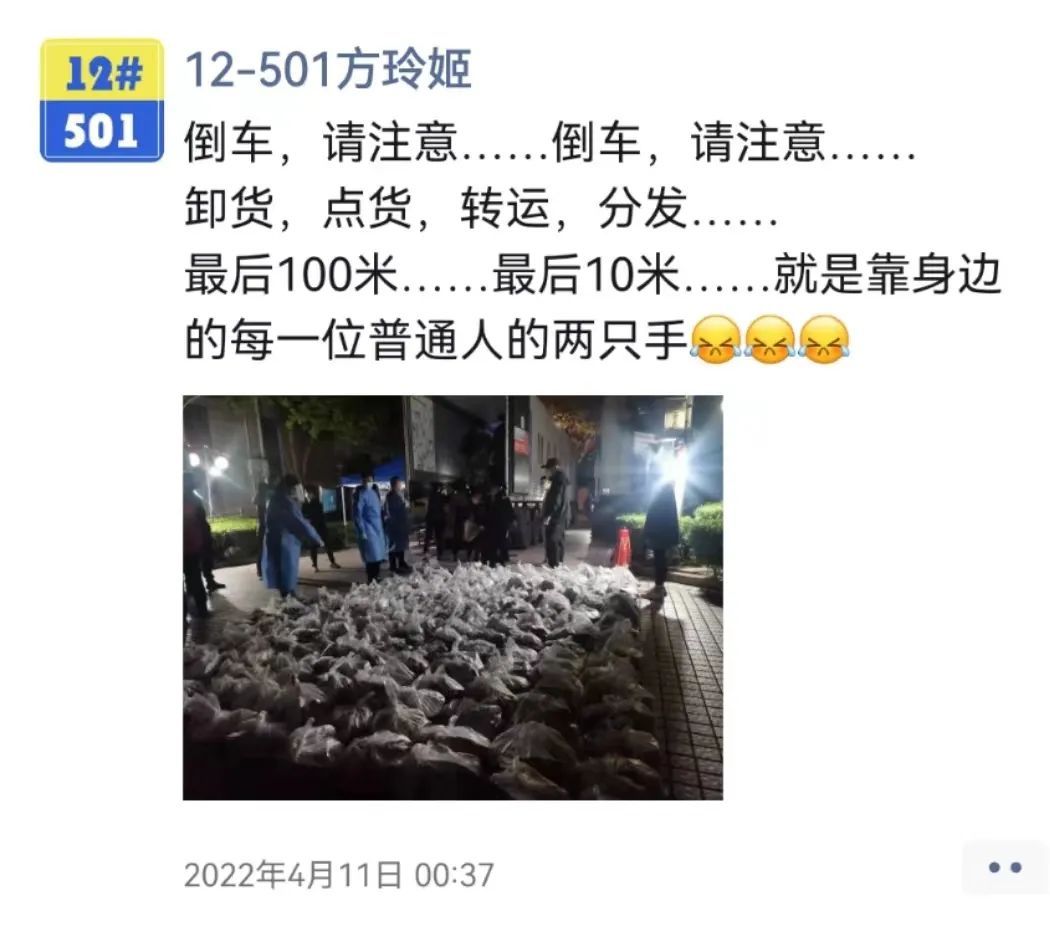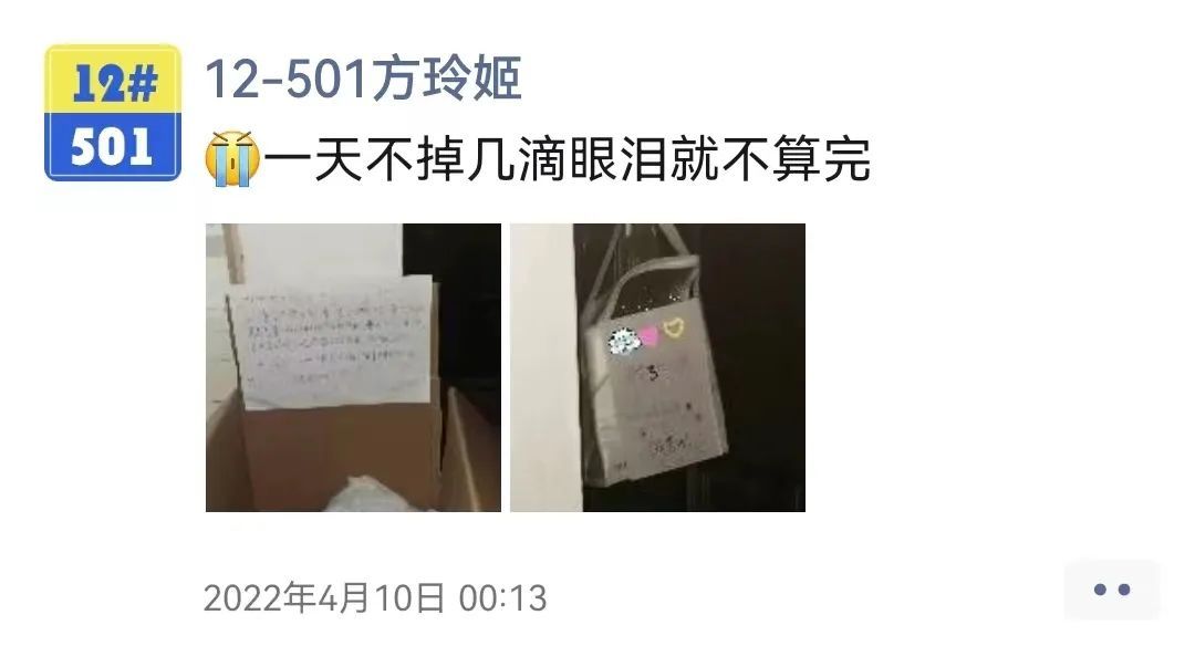 区城管执法局副局长方玲姬自4月1日起连日支援在居住社区一线,并兼任了区建管系统支援周桥街道疫情防控临时党支部书记。目前几乎各项志愿工种都经历了,常常深夜才结束工作。心思细腻的她不仅体察到社区工作者的加倍艰辛,也会被居民小小的体贴回报所感动。她欣赏过夜雨下的落花,凌晨12点后的抗疫日志成为微信发圈的常态。她说:“在社区抗疫,应该做的事,有太多太多;而我来得及做的事,太少太少。”