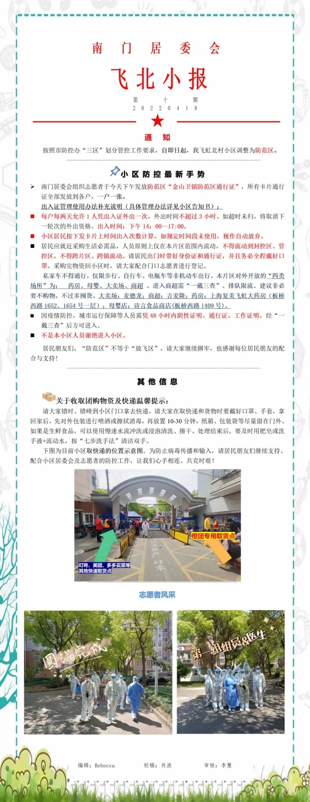 原来,《飞北小报》是小区在疫情期间的特殊产物。作为拆迁安置老小区,飞虹北村人员结构复杂,老年人居多,物业保安力量相对薄弱,楼组长的年龄也偏大。种种现实情况给小区疫情防控工作带来了更大的挑战。面临诸多困难,居委会临难而上、“见招拆招”,《飞北小报》应运而生,成为了信息互通的重要桥梁和展现志愿者风采的重要平台。