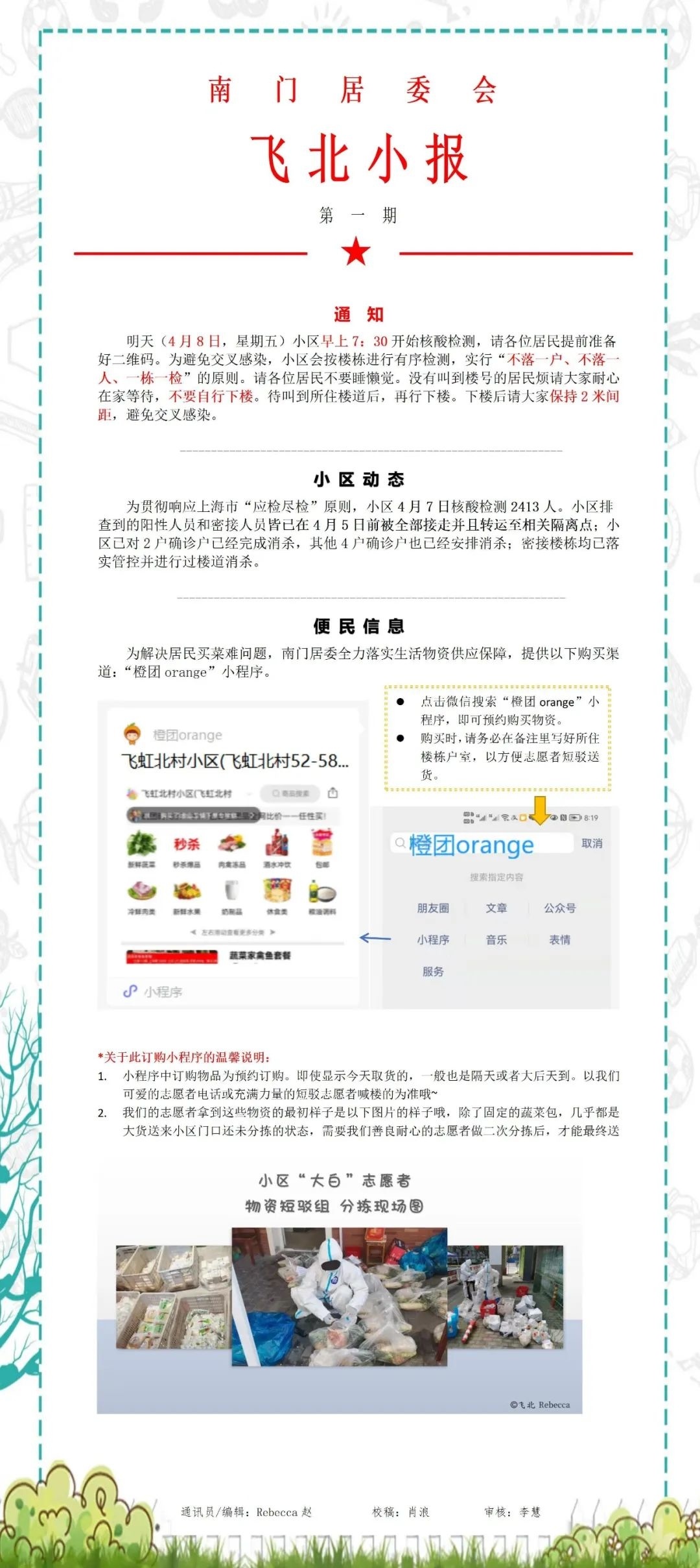 有了初步设想后,本身从事媒体协调联络相关工作的志愿者赵哂彦自告奋勇参与到小区的宣传通讯工作中,并成为了小报的编辑。4月7日,第一期《飞北小报》“横空出世”。经过多次商讨,小报设置了通知、小区动态、便民信息、倡议书、志愿者风采等多个板块,具体内容则根据实际情况动态调整,并每天以图片形式发到小区群里进行公开推送。