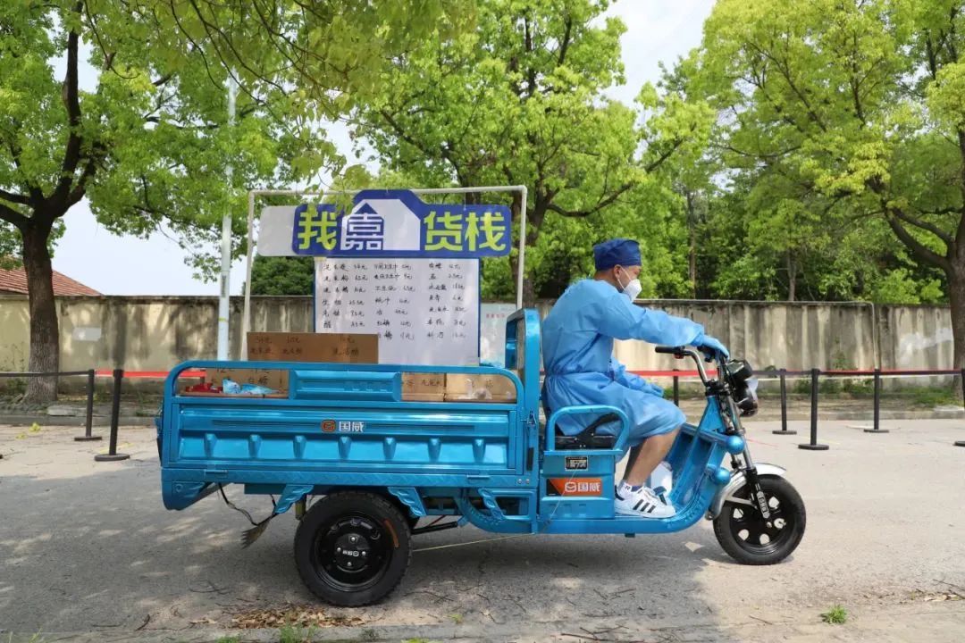 今天(4月20日)下午,在嘉定工业区越华社区99弄,一辆电动三轮车在小区内缓慢穿行,车上的喇叭里不时传来“越华社区‘我嘉货栈’开张啦!”的声音。原来,这辆小车是一处流动的“我嘉货栈”,车上摆放着一排排纸箱制作的简易货架,有餐巾纸、洗发水、调味料等二十多种商品。