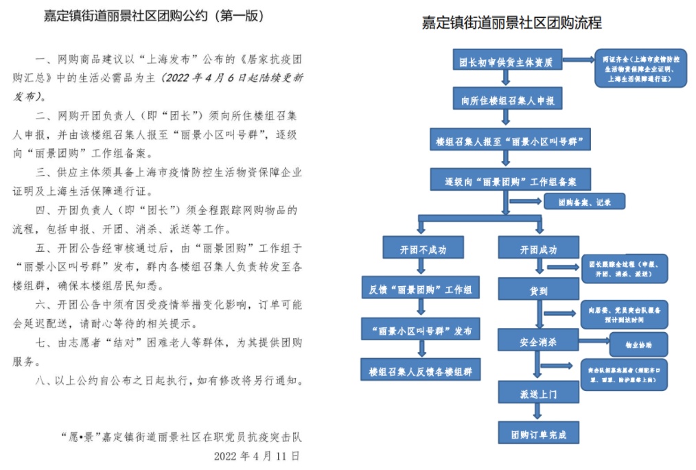 大家群策群力,从团购服务的规范化操作和防疫安全性等方面深入探讨,编写形成《嘉定镇街道丽景社区团购公约(第一版)》《嘉定镇街道丽景社区团购流程》,转发至小区75个楼组群,让全体居民知悉。