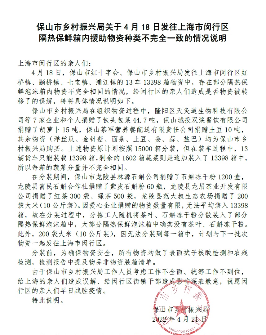 附:保山市乡村振兴局关于 4 月 18 日发往上海市闵行区隔热保鲜箱内援助物资种类不完全一致的情况说明