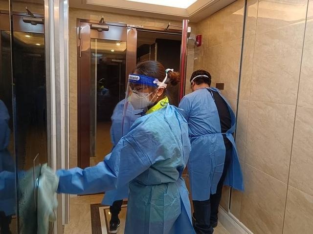 罐装满消毒液后,队员需要负重10多公斤,一层层爬楼。据悉,整个东方逸品小区内有4幢高层居民楼,最高的达33层,喷完后还需要重新罐装。他们之中,有的忍受着高浓度的消杀环境,完成所有公共空间的喷洒;有的人对把手、电梯按钮进行消毒擦拭,双手已经发白开裂;有的人在消防通道清洁扶手,一走就是33层……队员们都累得气喘吁吁,但依然坚持完成了任务。