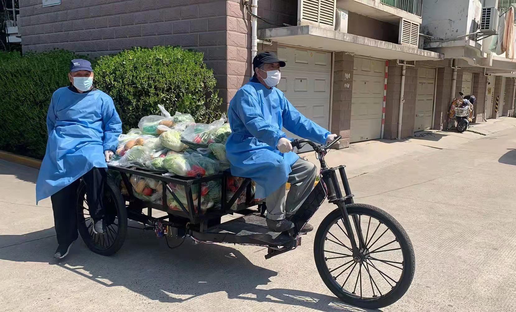 在小区里有一支配送“天团”,他们有时骑着电瓶车,有时拉着平板车,装载大大小小的包裹,奔赴一个又一个的居民楼栋,完成“最后一公里”的配送。彭浦镇万荣佳苑居民委员会书记张春兰介绍,这支团队的成员包含小区业委会副主任委员、楼组长、物业保安和志愿者。