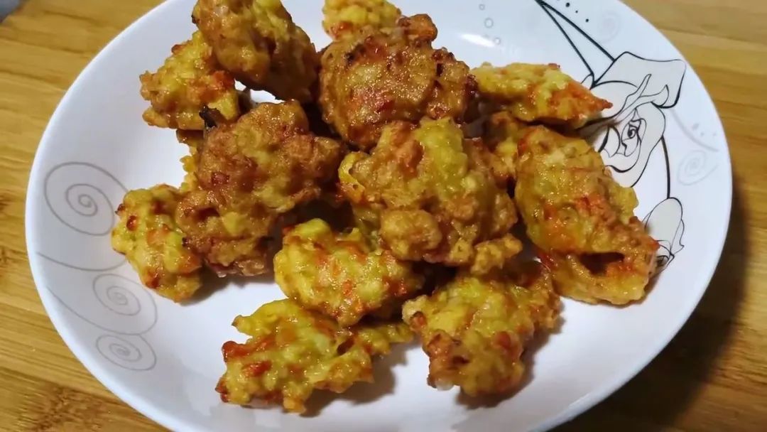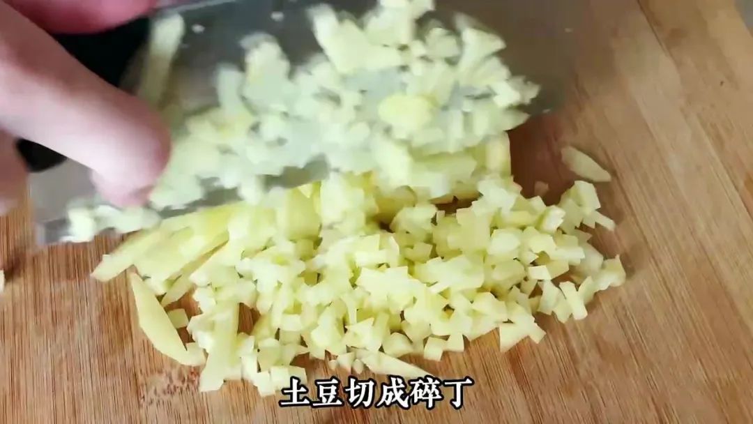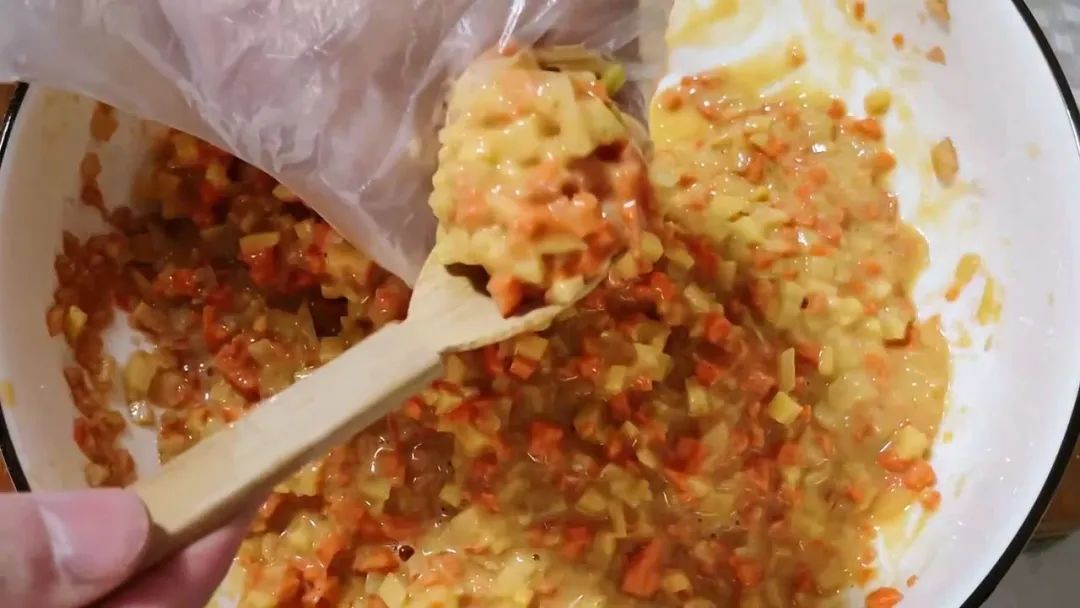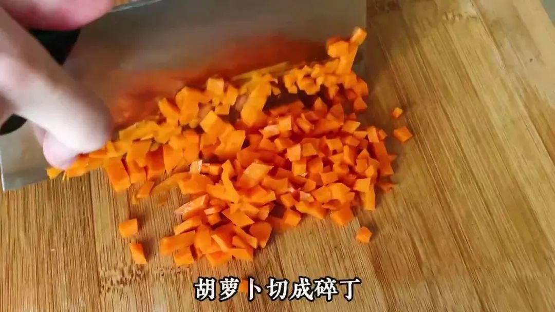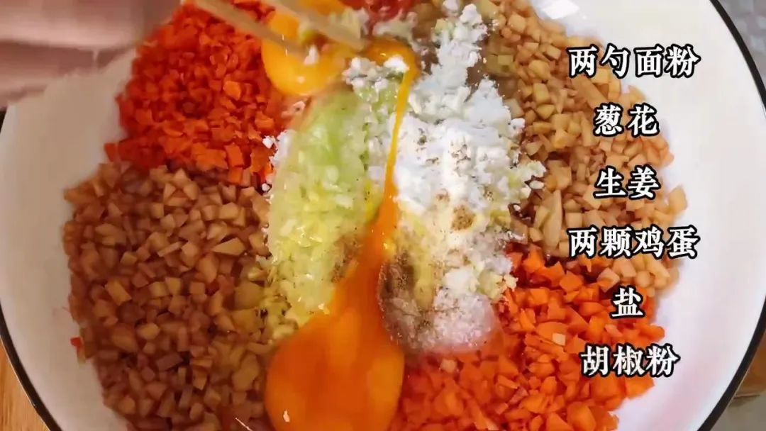 ③ 胡萝卜和土豆丁放在盘内,加入两勺面粉、葱花、生姜、两个生鸡蛋,以及盐和胡椒粉少许进行搅拌;