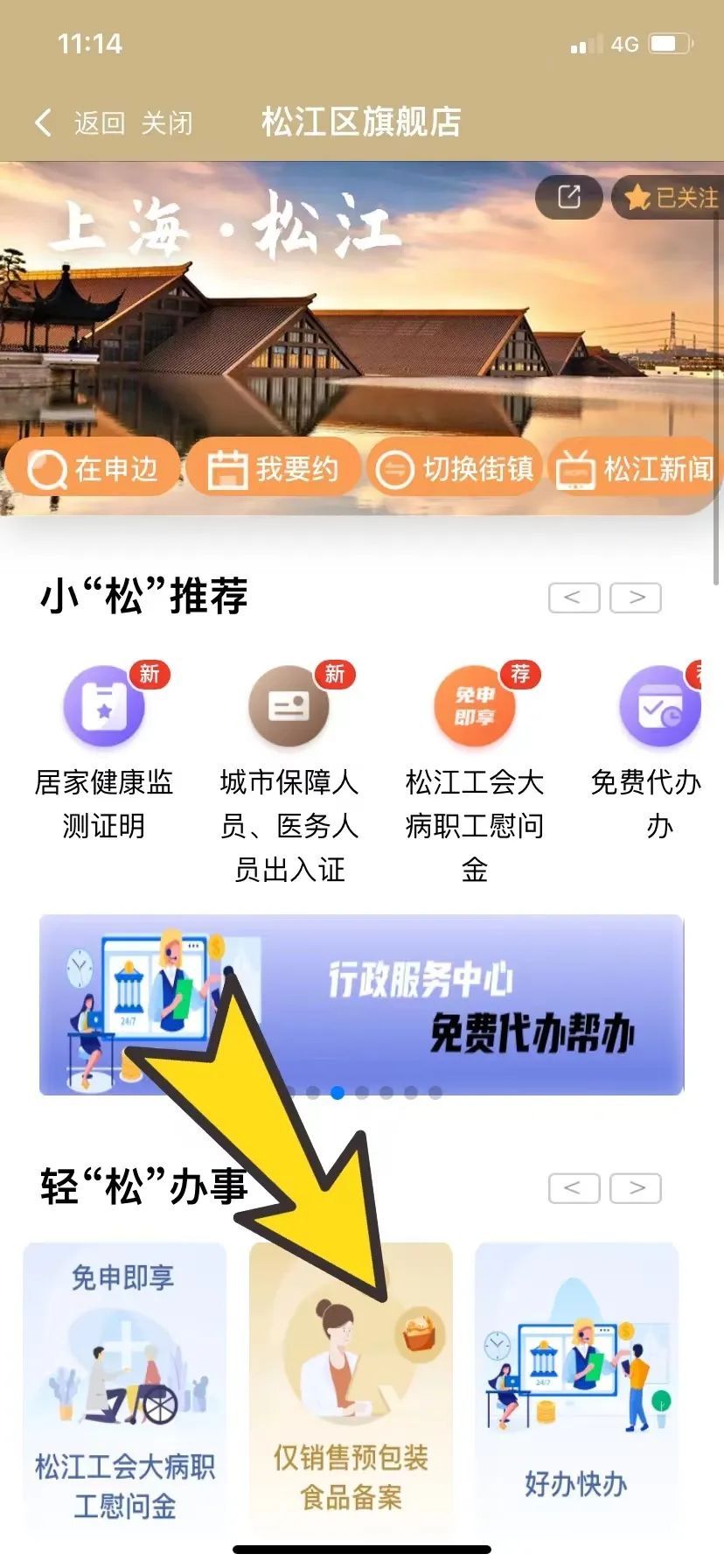 2、进入“松江旗舰店”,点击首页“轻松办事”的“仅销售预包装食品备案”