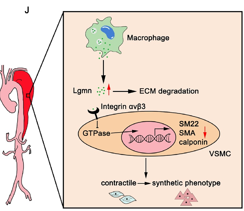 图.巨噬细胞分泌的Lgmn结合到平滑肌细胞表面的整合素αvβ3,并抑制GTP酶的活化,从而减少平滑肌细胞收缩型标志物的转录