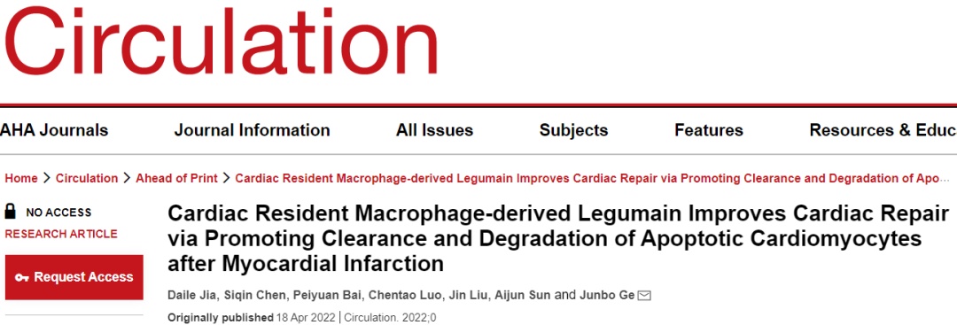 在国家自然科学基金项目等资助下,中国科学院院士、复旦大学附属中山医院心内科主任葛均波教授、孙爱军教授领衔的研究团队在心肌梗死后凋亡心肌细胞清除降解的研究中取得新进展,研究成果以“心脏原位巨噬细胞来源的Legumain通过促进心肌梗死后凋亡心肌细胞的清除和降解来改善心脏修复“(Cardiac Resident Macrophage-derived Legumain Improves Cardiac Repair via Promoting Clearance and Degradation of Apoptotic Cardiomyocytes after Myocardial Infarction)为题,于2022年4月18日发表在《循环》(Circulation)(IF=30)杂志上。文章第一作者为贾代乐医生、陈思勤博士、柏佩原博士、骆晨涛医生。复旦大学特聘教授胡凯教授在稿件修改过程作出了贡献。