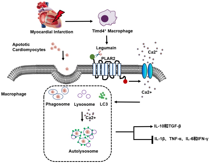 胞葬作用是通过吞噬细胞内吞作用对凋亡细胞进行处理和降解的过程。心肌梗死发生后,以巨噬细胞为主的专职吞噬细胞通过识别凋亡心肌细胞表达的“找到我”和“吃掉我”的信号发挥胞吞作用,清除、降解凋亡的心肌细胞,从而减轻炎症反应,促进损伤组织修复。心肌缺血后,心肌细胞发生坏死和凋亡,大量死亡的心肌细胞需要巨噬细胞高效且持续地摄取并清除这些细胞碎片,然而,调控巨噬细胞持续清除和降解内容物的机制仍然未知。半胱氨酸蛋白酶(cysteine protease,CP)是一类在酶的活性中心含有半胱氨酸残基的蛋白水解酶,这一大家族成员中包括天冬氨酸特异性半胱氨酸蛋白酶(caspases)、 组织蛋白酶(cathepsins)、钙蛋白酶(calpain)和豆荚蛋白(legumain,Lgmn)等。Lgmn是一种位于巨噬细胞溶酶体内的高度特异性的天冬酰胺酰基内肽酶,其作为 CP 家族的 一员,除了与其他 CP 家族成员一样参与调控细胞增殖与凋亡,同时又在介导免疫炎症方面发挥重要作用。