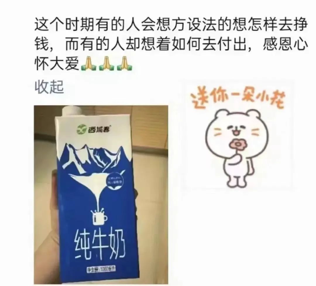 4月23日,安亭镇新安社区居民收到了一份特别“礼物”——一盒来自新疆的1升装牛奶。爱心物资的捐赠者,是居民王勇。经过2天的筹措,在社区工作人员和志愿者的协助下,360箱、2000多盒牛奶发放到所有社区居民手中。